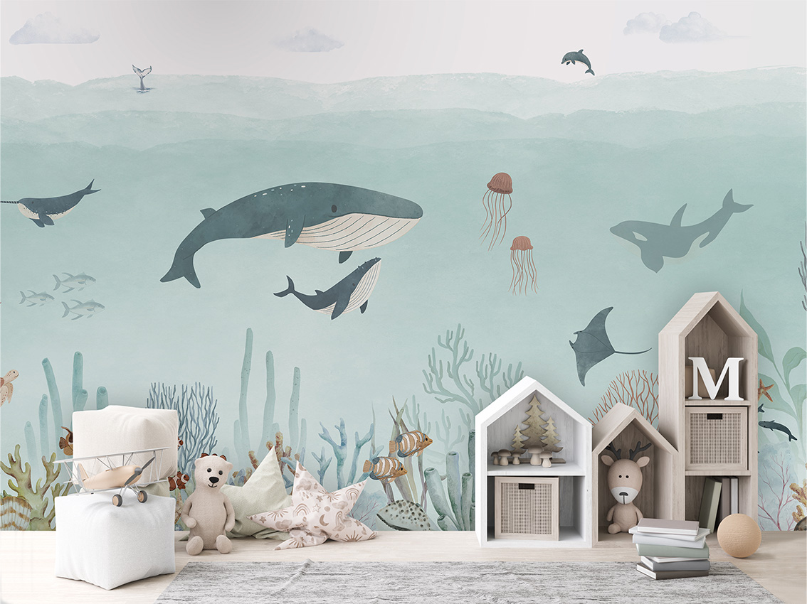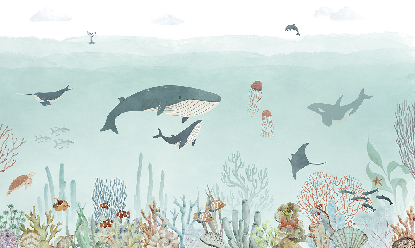 Transformă camera copilului într-un univers acvatic captivant! Tapetul cu ilustrații marine delicate aduce un strop de aventură și mister. Tonuri liniștitoare de albastru pentru un ambient relaxant. Perfect pentru camera bebelușului sau a copilului mic.
