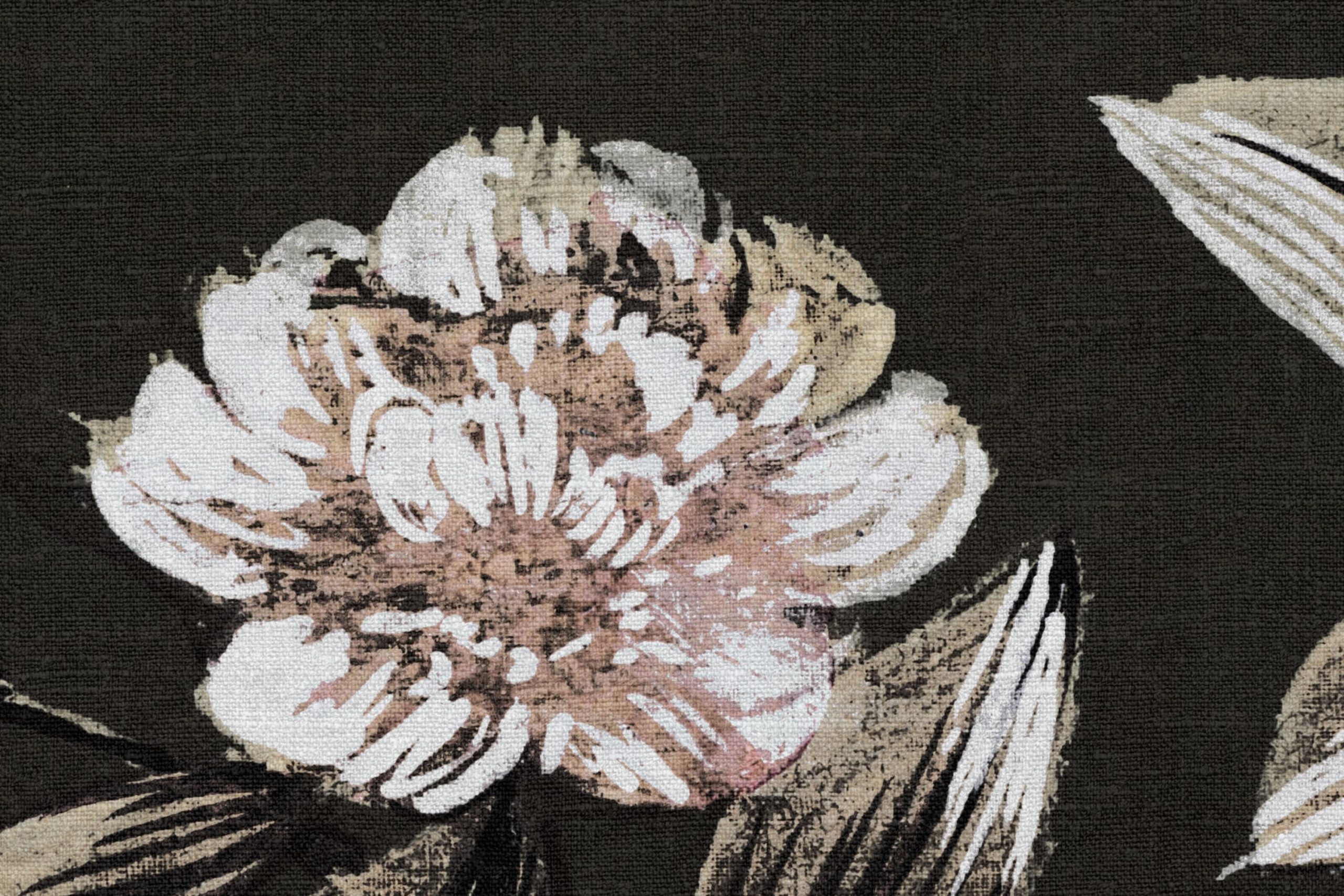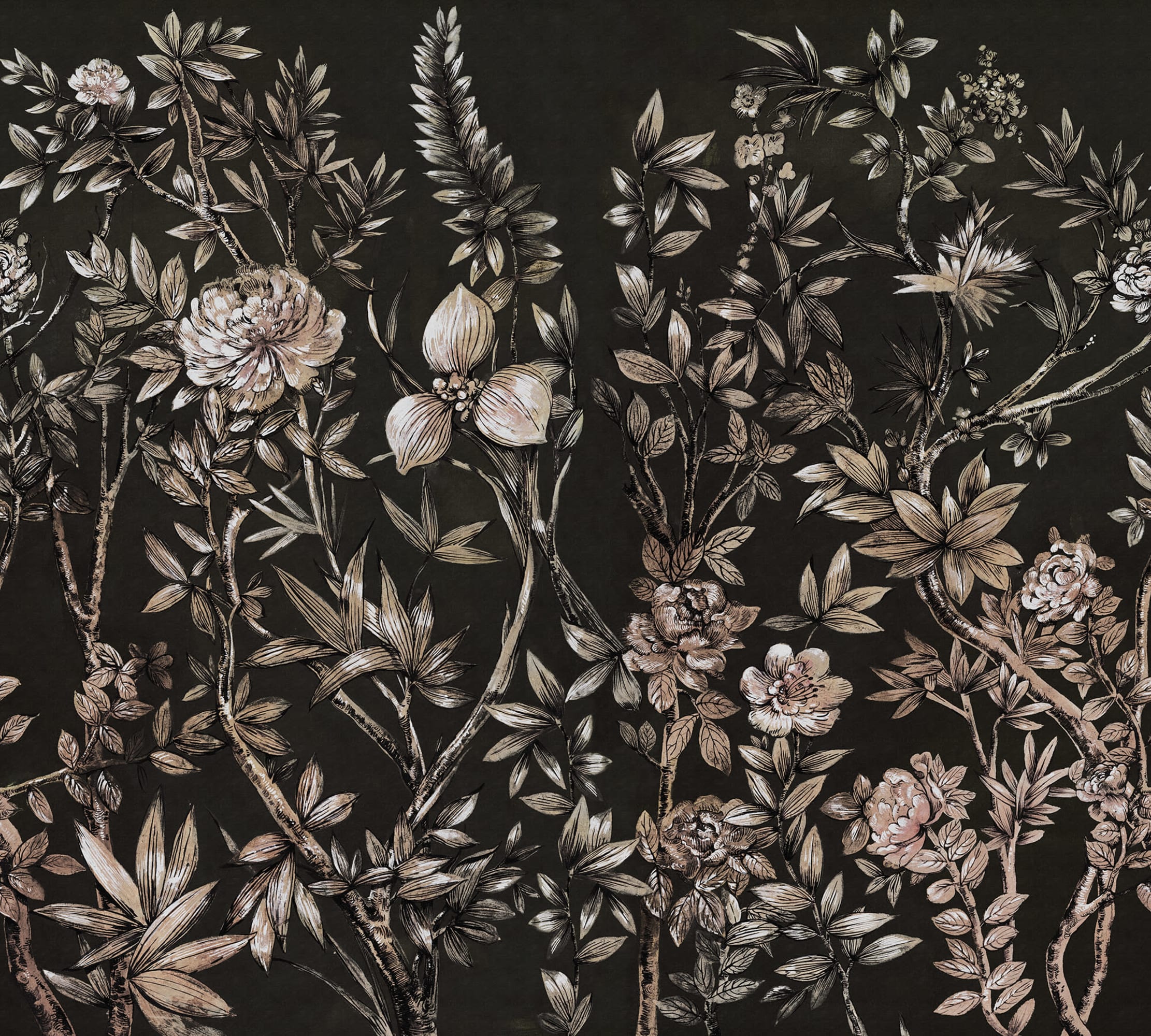 Un model floral minunat pictat manual pe pânză. Un model romantic care aduce în minte dantele și funde. Drăguț, dar elegant. Flori, frunze și ramuri grațioase acoperă peretele. Intens și cu un contrast dulce între detaliile mai moi și cele mai accentuate. Silk Floral, Midnight, vine în nuanțe de maro și bej pe un fundal închis.
