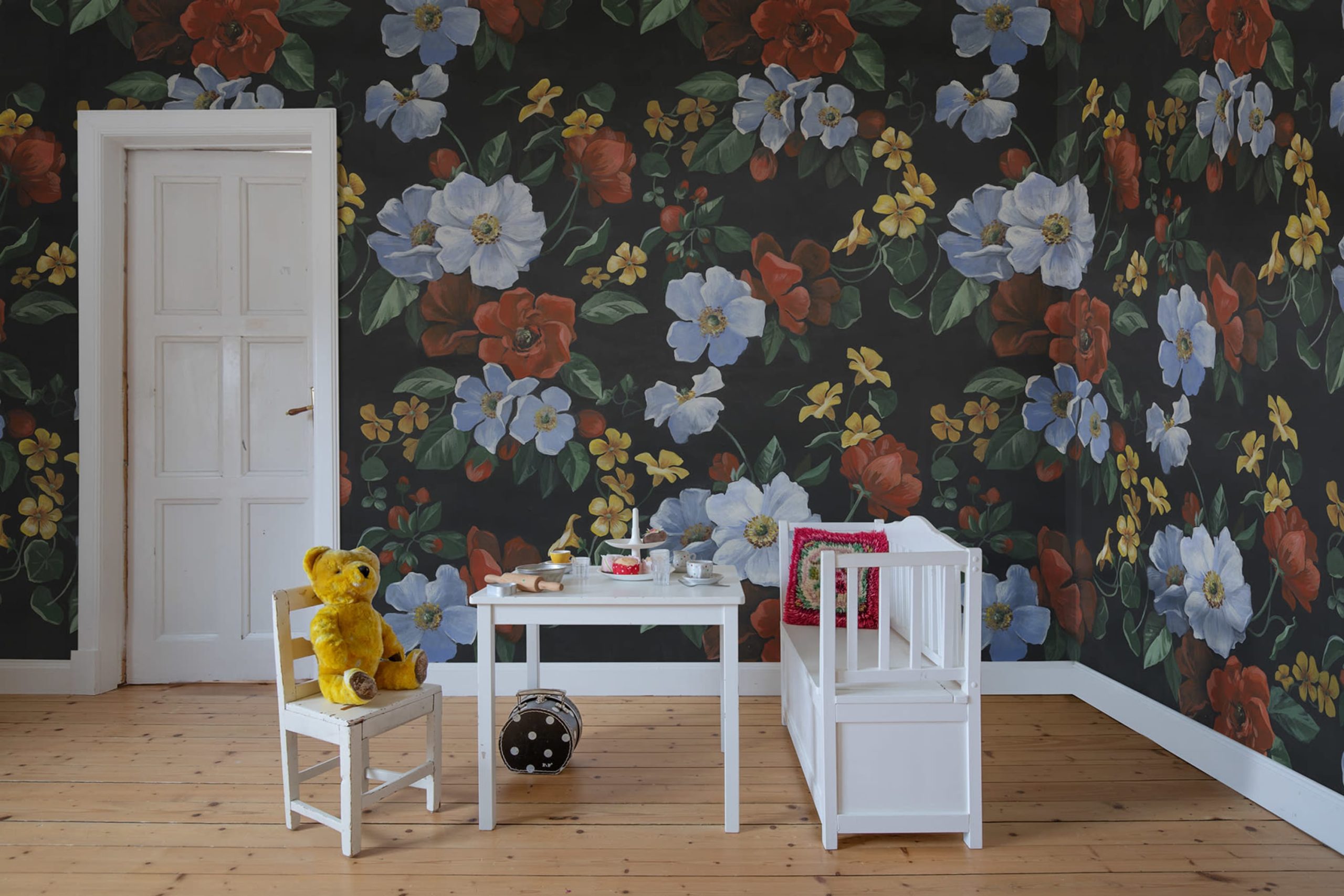 O adevărată frumusețe, într-adevăr. Acest model impresionant, dar totuși drăguț, în stil de casă de la țară, a fost pictat manual pe o pânză și ulterior scanat pentru a fi folosit ca tapet. Designul se potrivește într-un ambient romantic, iar scala mare îi conferă acel impuls de încredere necesar în majoritatea camerelor. Varianta de culoare Summer are un fundal negru dramatic și flori în nuanțe vibrante de albastru, roșu, galben și frunze verzi.