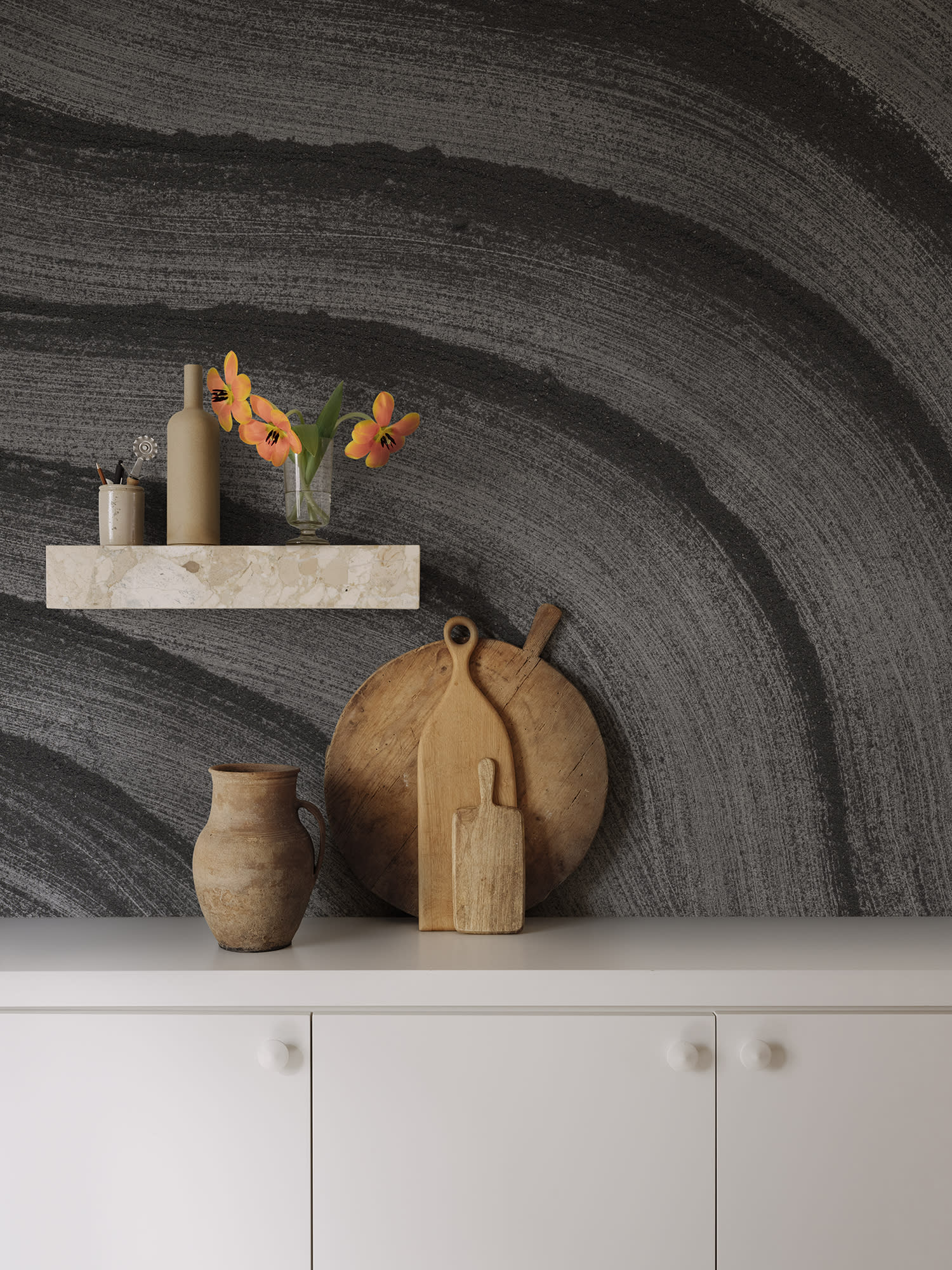 Design organic remarcabil cu un efect calmant zen. Acest design uimitor este un exemplu fabulos de cum meșteșugul tactil întâlnește tehnicile actuale de imprimare digitală. Pictat manual fără instrumente, cu cenușă pulbere pe hârtie și apoi scanat pentru a crea un tapet extraordinar.