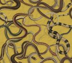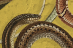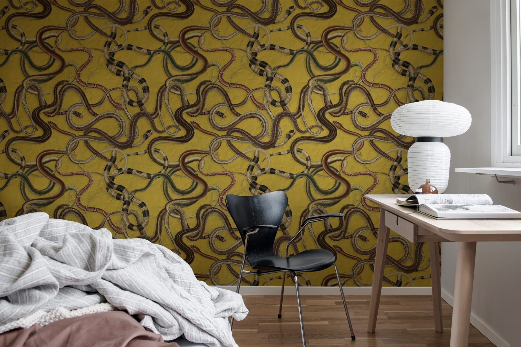 Snakey, Yellow, alegerea supremă pentru a vă transforma spațiul de locuit într-un sanctuar fascinant al frumuseții naturii. Tapetul nostru din piele de șarpe prezintă ilustrațiile complicate ale numeroaselor specii de șerpi și modelele lor captivante pe un fundal galben.
