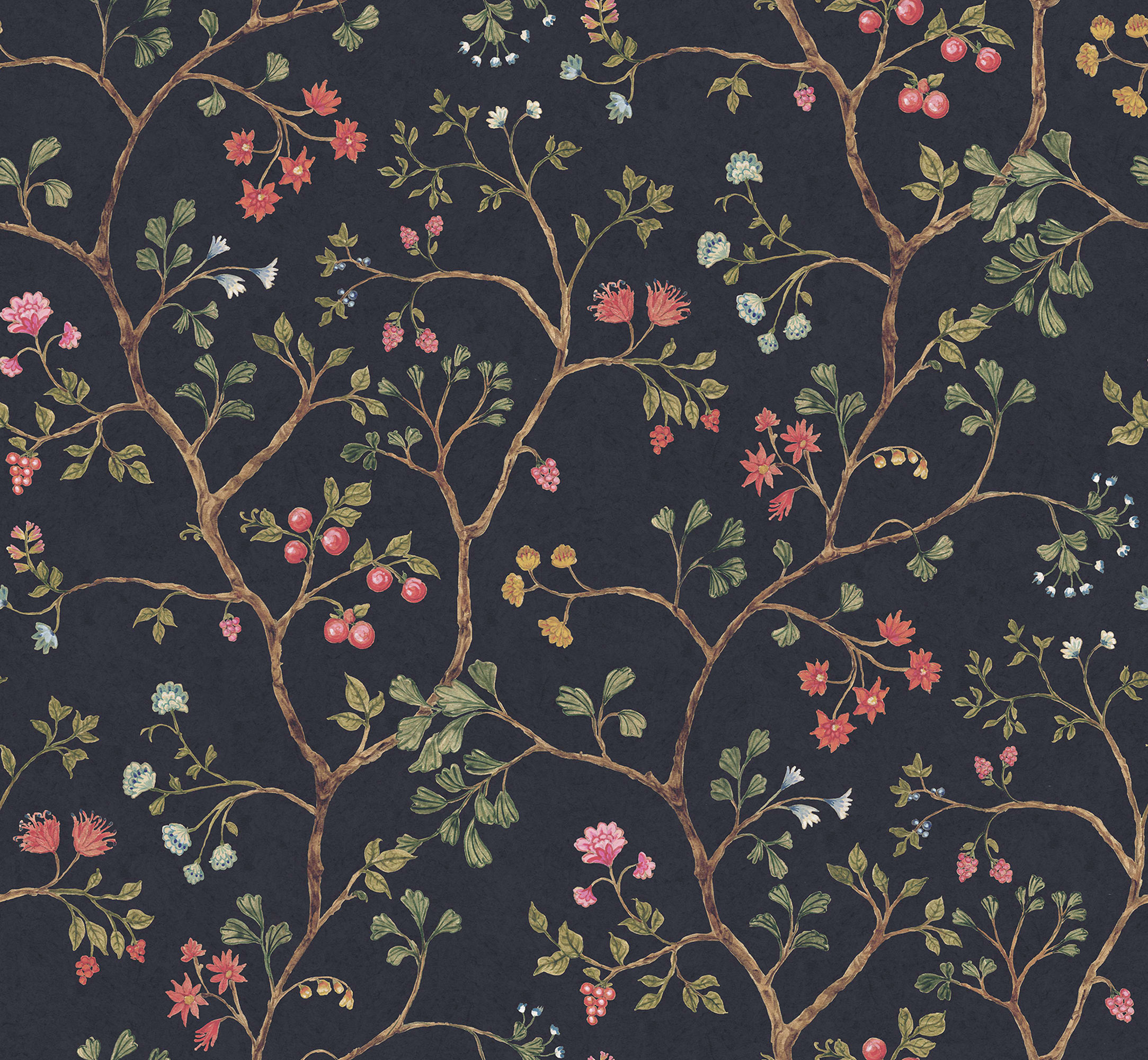 O încântare absolută! Song Tree, Lush, iese cu adevărat în evidență cu fundalul întunecat și luxuriant și cu florile și fructele de pădure strălucitoare și colorate. Arborele cântecului este un model delicat cu ramuri, flori și fructe de pădure care ajung sus, pe o structură asemănătoare hârtiei. Designul oferă o impresie ușoară, romantică, dar exclusivistă.