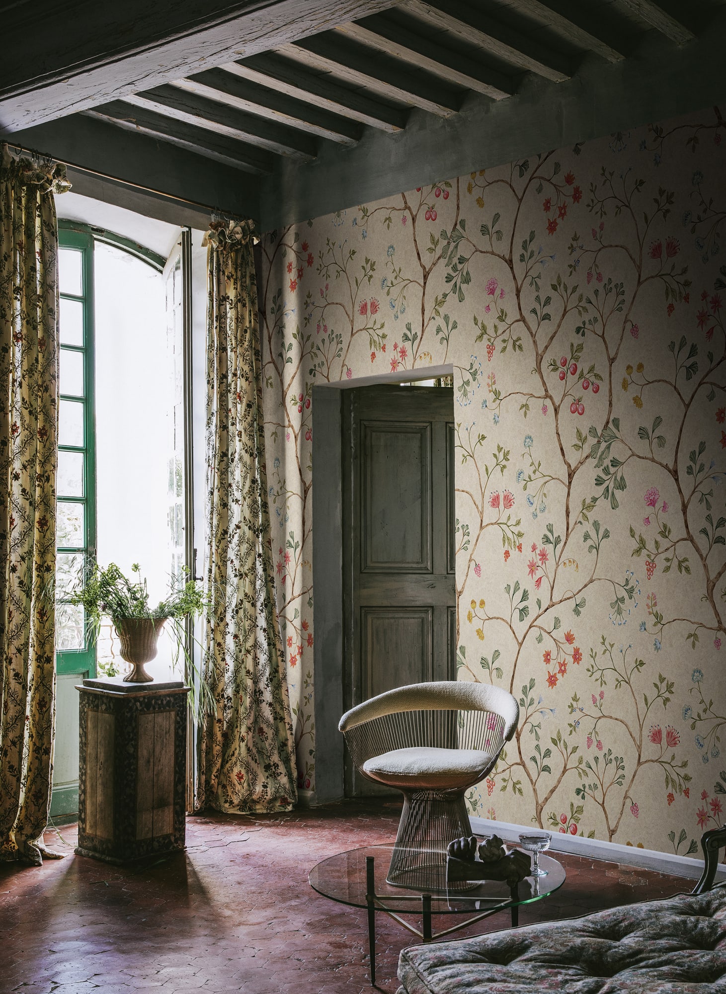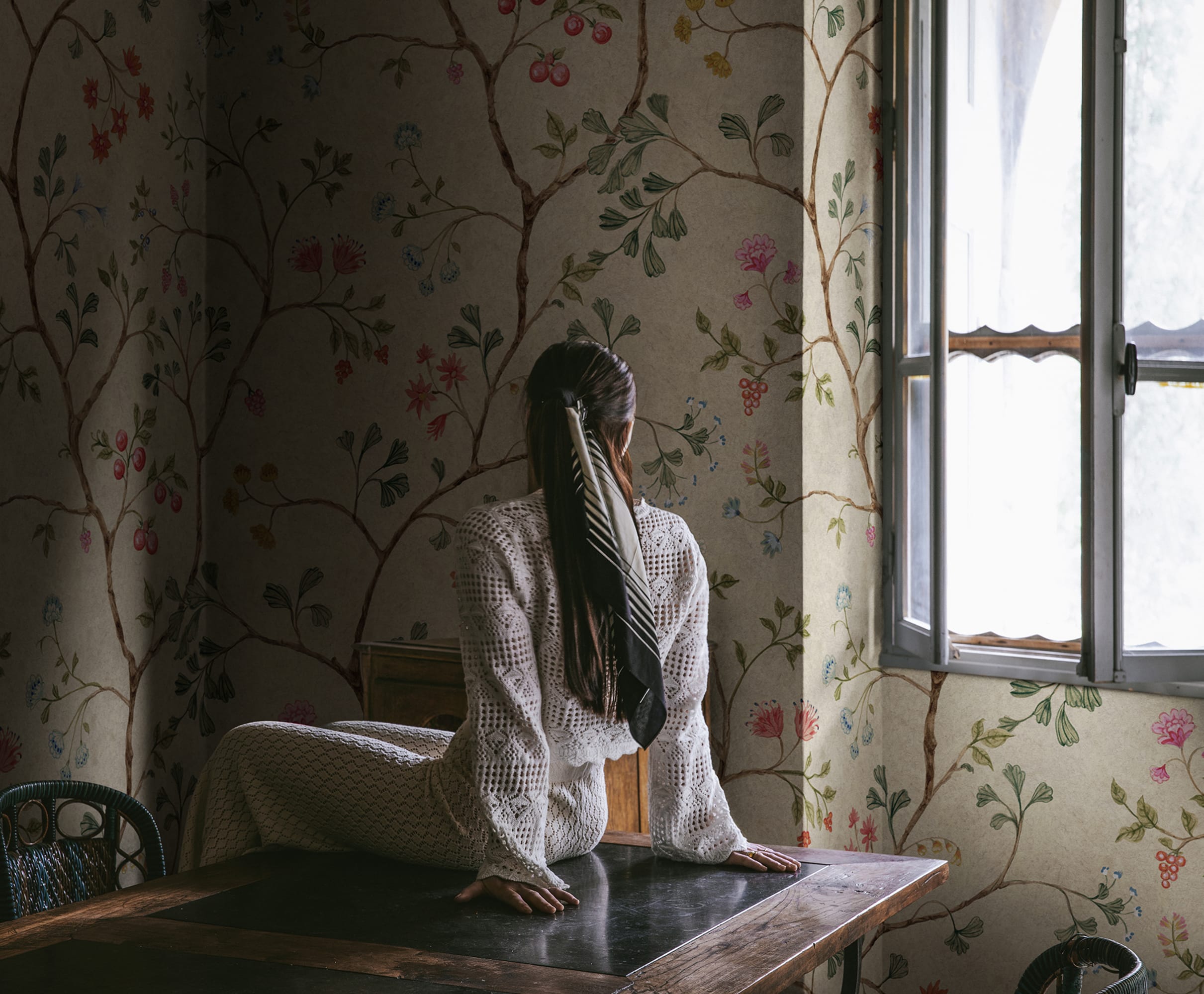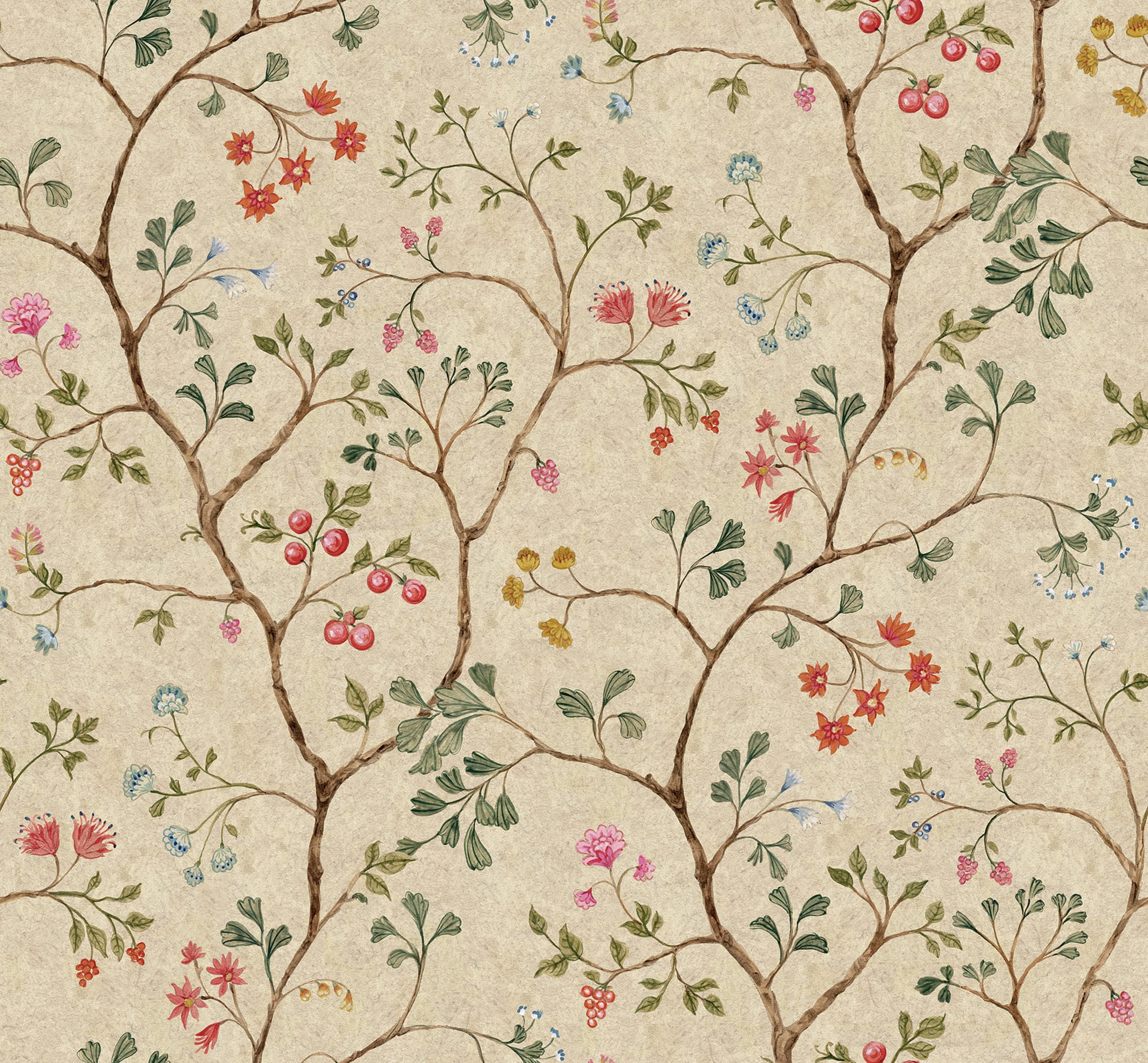 Modelul Song Tree, Sand oferă o senzație aerisită și plină de culoare. Ramuri în creștere, flori bogate și fructe de pădure se întind peste perete. Structura este asemănătoare hârtiei și dezvăluie schițele timpurii din fundal. Un plus de lux care oferă casei tale o expresie aerisită.