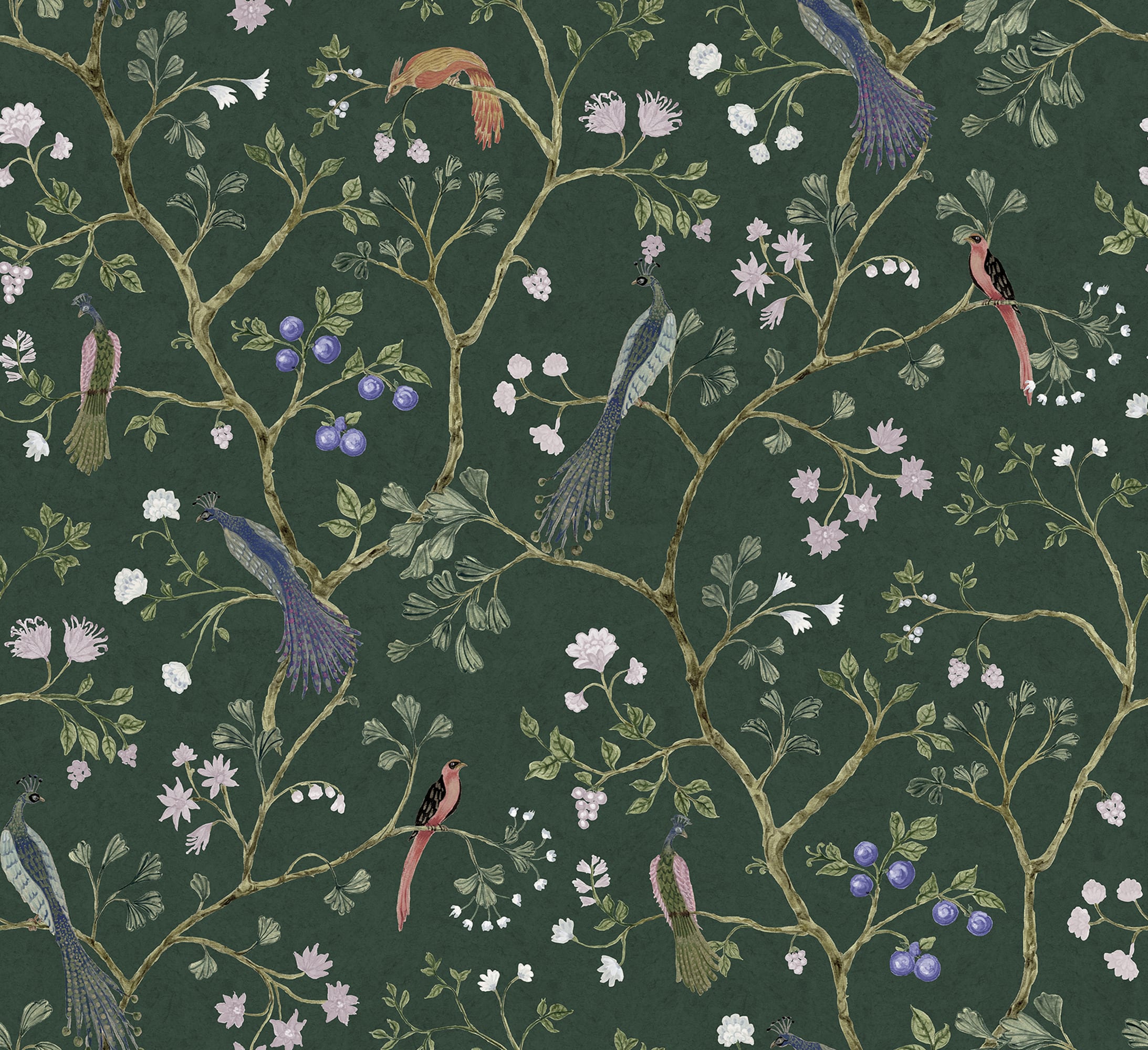 Songbirds este un tapet sofisticat cu ramuri frumoase de copaci care cresc peste perete, împodobite cu flori delicate, fructe de pădure coapte și păsări tropicale. În varianta mai închisă Emerald, Songbirds dă o impresie senină, dar grandioasă. De ce nu în locul de luat masa, ca fundal pentru o cină confortabilă la lumina lumânărilor.