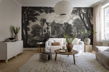 Frunzișul aerisit se întinde spre cer. Acest mural este un adevărat magnet pentru ochi, cu flori vii, fructe de pădure și păsări exotice pe un fundal profund de șofran. Modelul mare cu ramuri de copac care cresc peste perete face o impresie uimitoare, deschizând spațiul și făcându-l să se simtă ușor, romantic și șic.