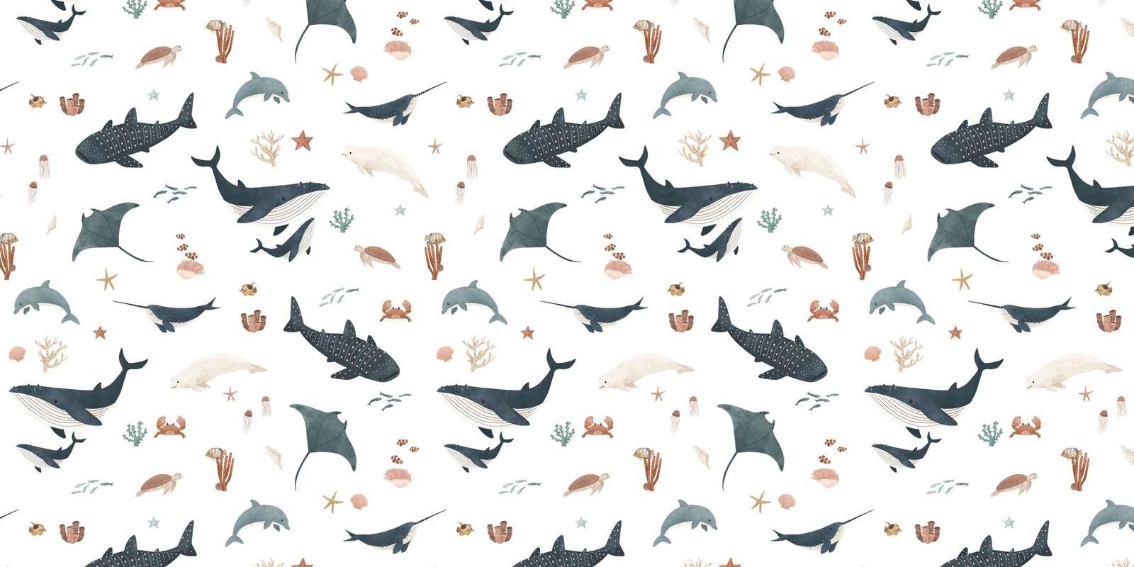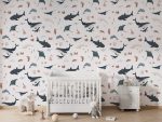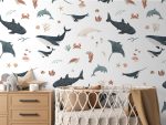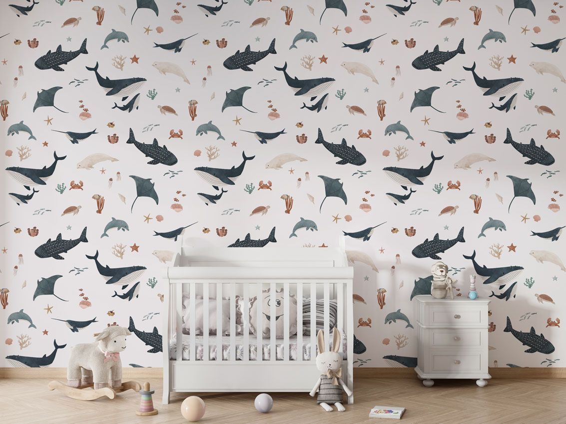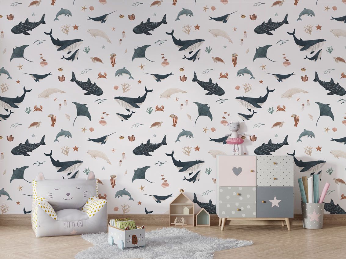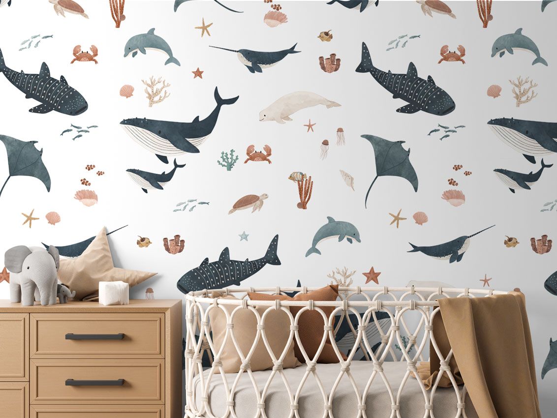 Transformă camera copilului într-un tărâm acvatic! Acest tapet încântător, cu diverse creaturi marine pe fundal alb, aduce un strop de aventură subacvatică în decorul interior. Ideal pentru camere de copii sau spații de joacă.