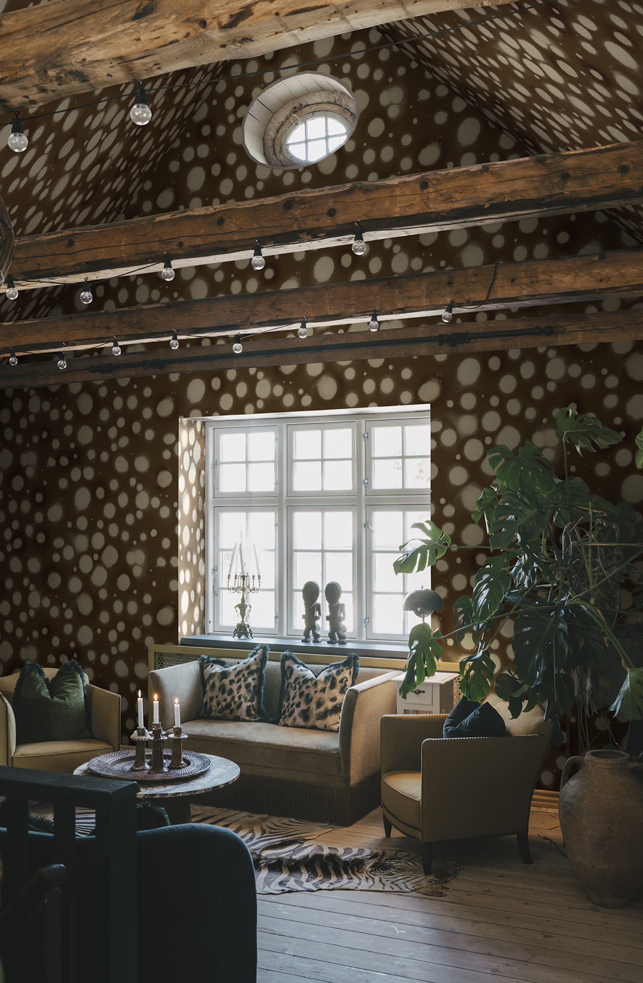 Acest tapet este numit și inspirat de peștele puffer pătat care este la fel de cool și impresionant. Acest model cu pete este o declarație îndrăzneață și încrezătoare în orice spațiu rebel. Și este și mai frumos când acoperă atât pereții, cât și tavanul. Paleta de culori Maro are un fundal maro închis și pete care plutesc de culoare bej.
