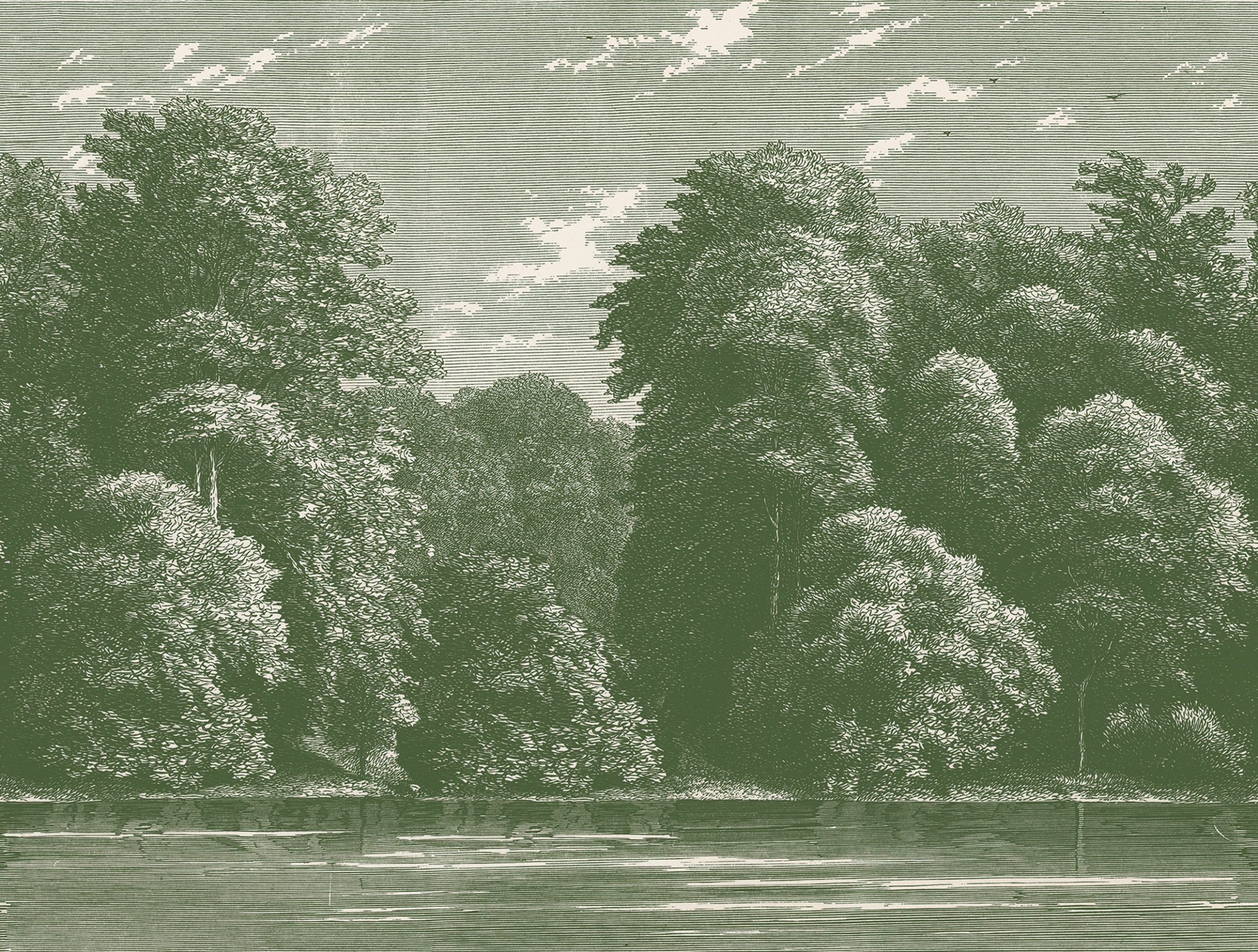 Sezonul de primăvară înfățișează o pădure luxuriantă minunată de pe malul apei. Designul este o gravură cu milioane de linii, făcându-l foarte detaliat și adăugând profunzime. Verdele este o culoare caldă ce oferă o senzație de îmbrățișare, în timp ce modelul creează o senzație de aerisire în cameră.