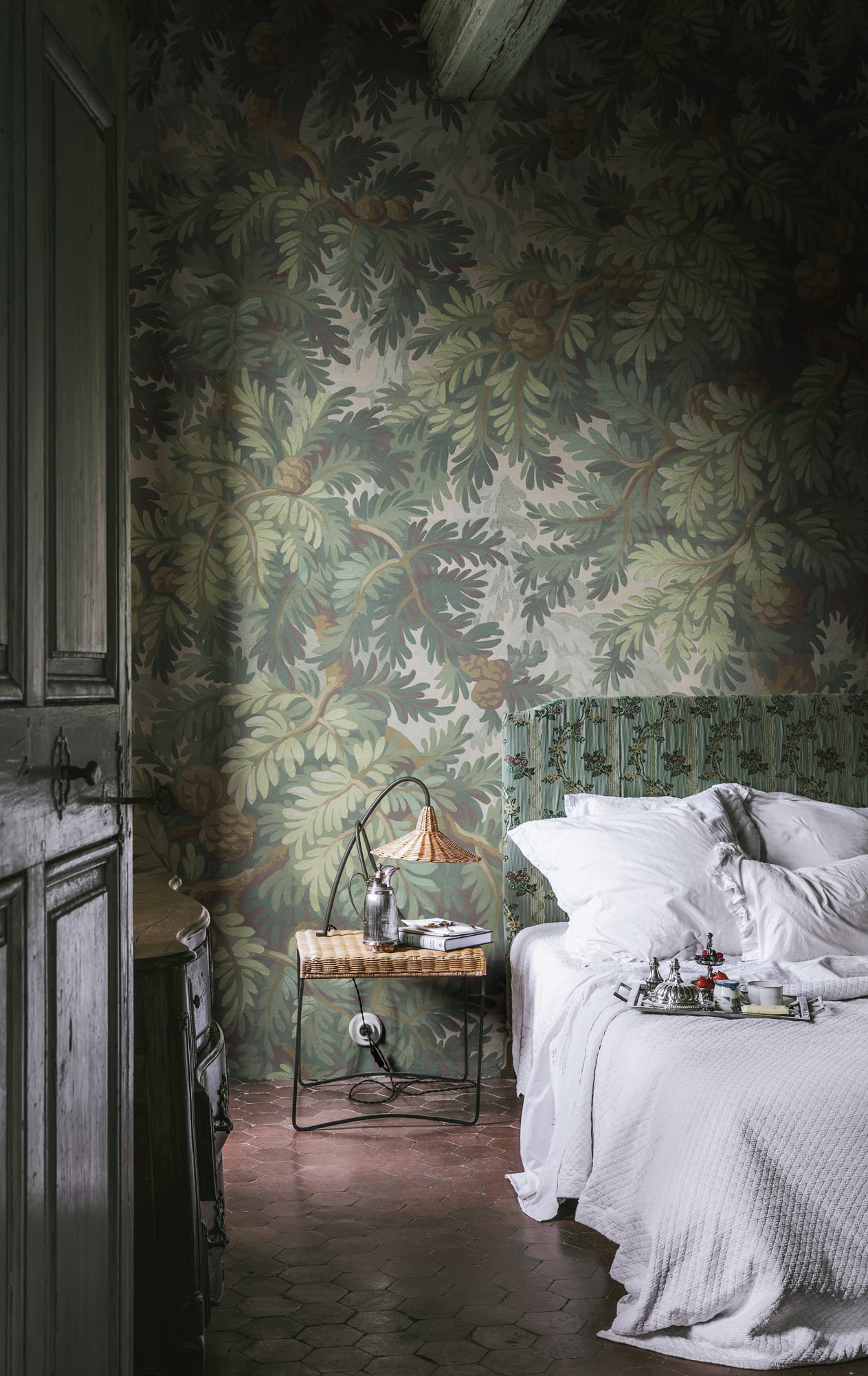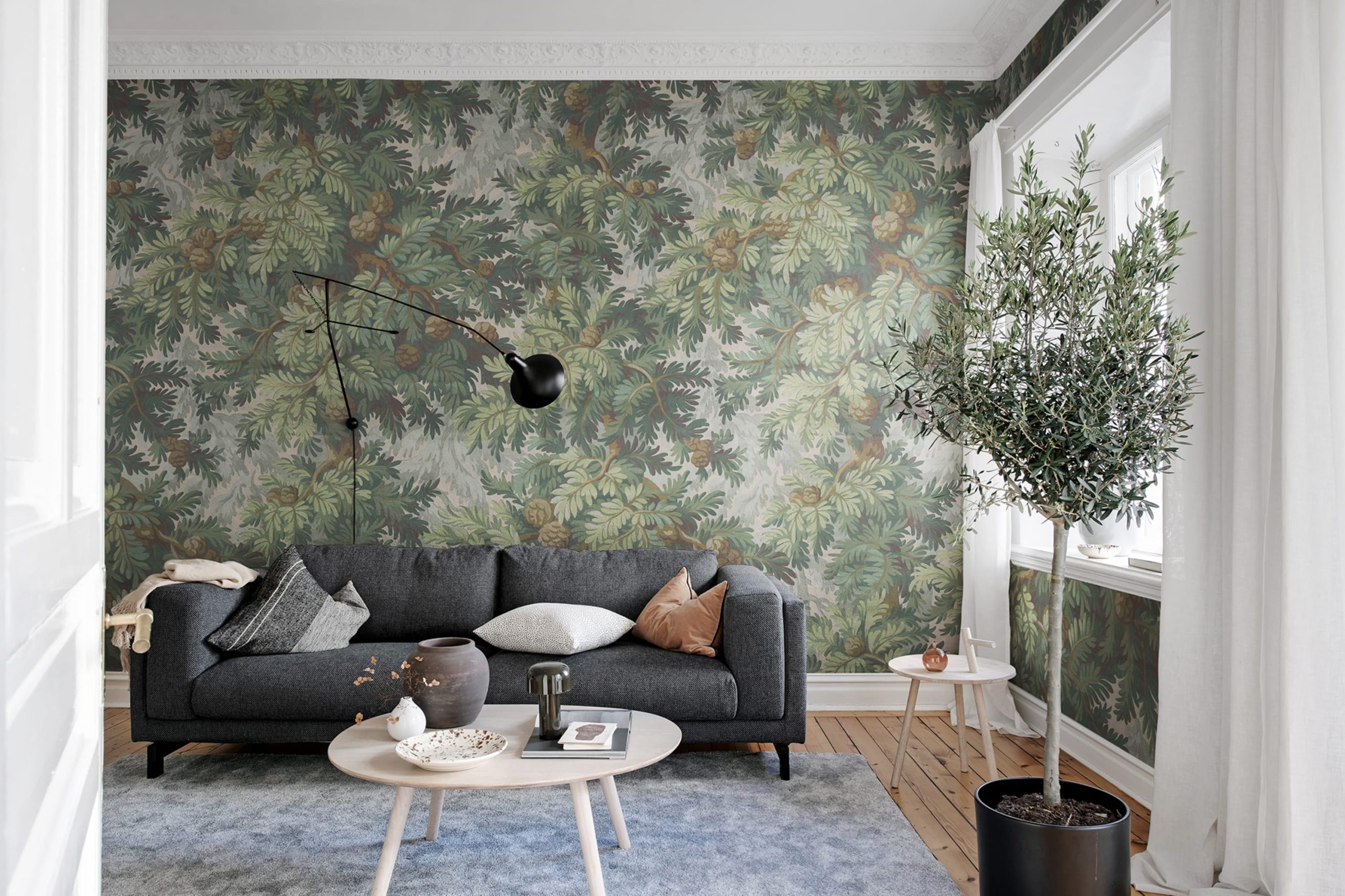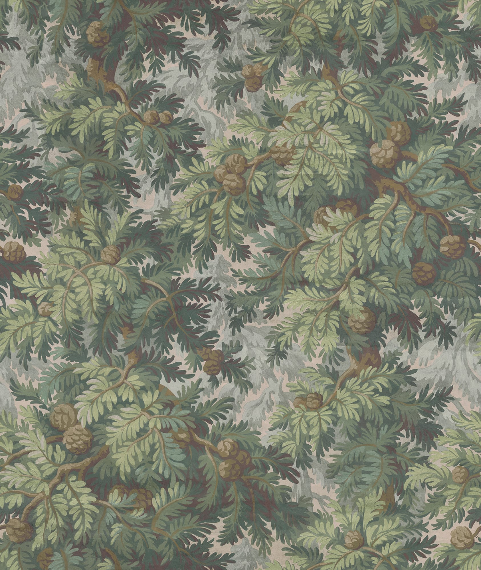 Acest model își are originea într-un material textil vechi din secolul al XIX-lea. Ramurile ondulate de molid, conurile și acele de copac creează o atmosferă învăluitoare. Un design la scară largă, cu tușe vizibile și care lasă o impresie caldă și plăcută. Perfect pentru un dormitor confortabil.