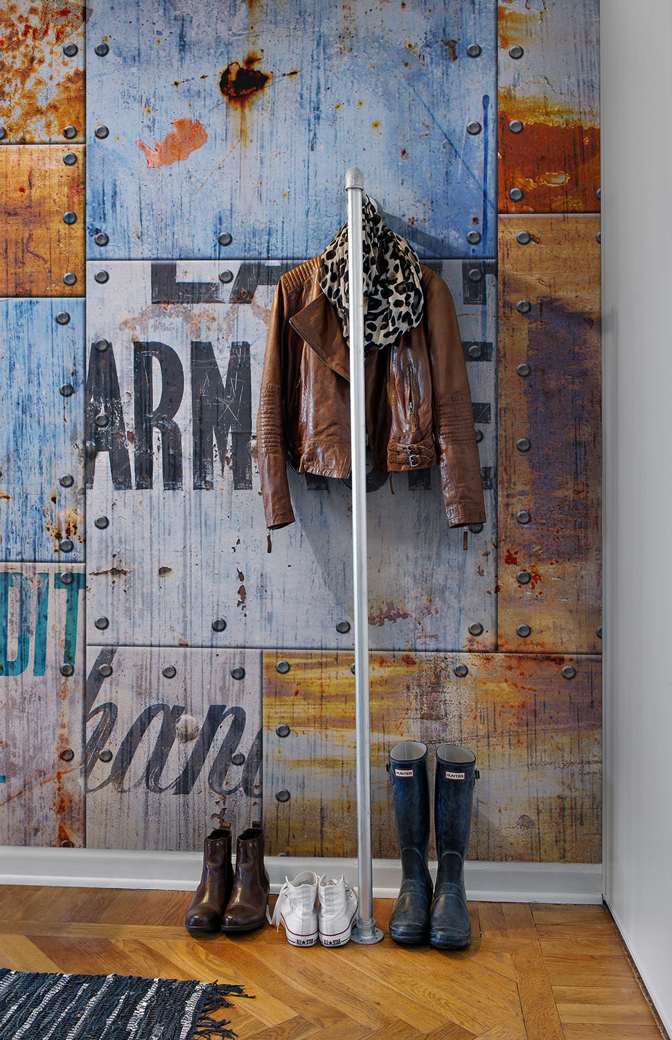 Decorează într-un stil industrial! Dungat, dur și brut. Combină albul, griul și negrul cu acest fototapet cu metal.