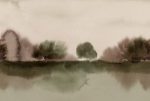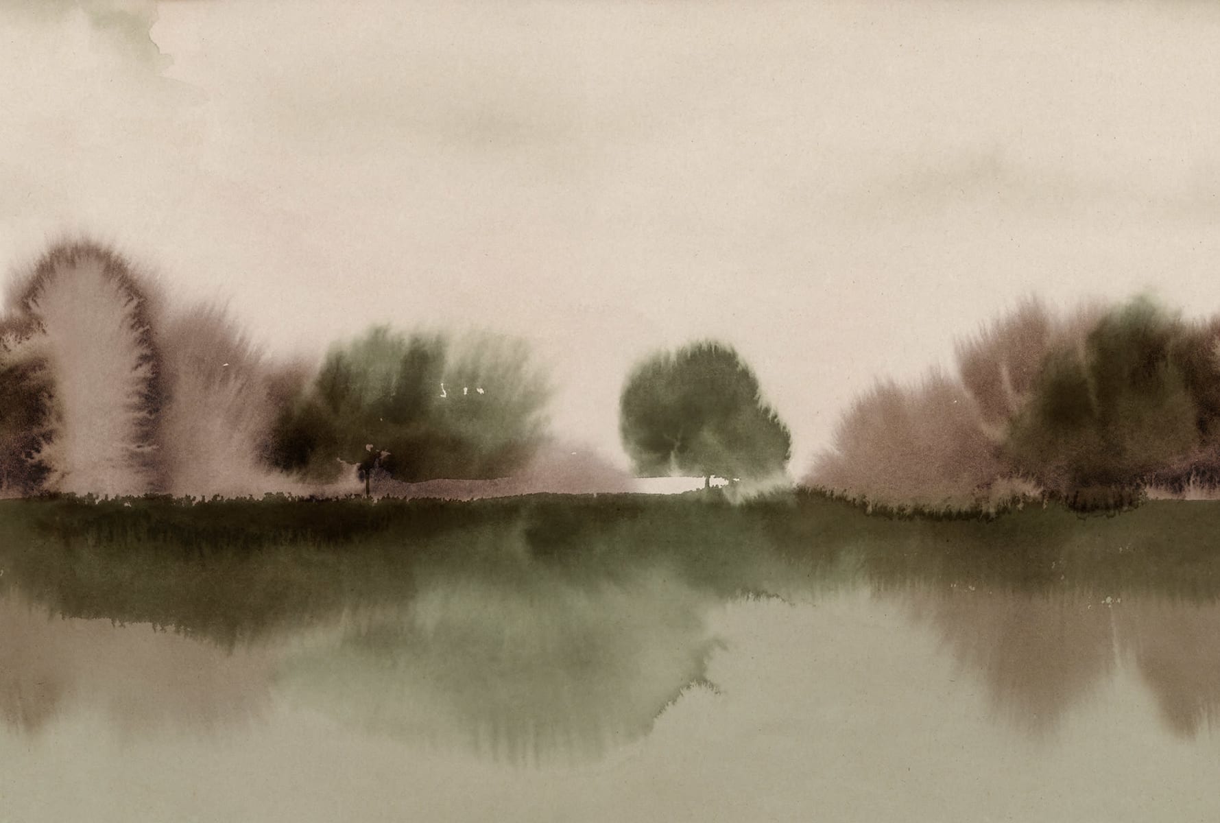 Această acuarelă de vis te transportă într-un frumos peisaj pictat și reflexiile sale. Tușele delicate și nuanțele eterice creează o atmosferă zen în casa ta. Paleta de culori Green prezintă nuanțe de maro cald și verde.