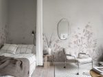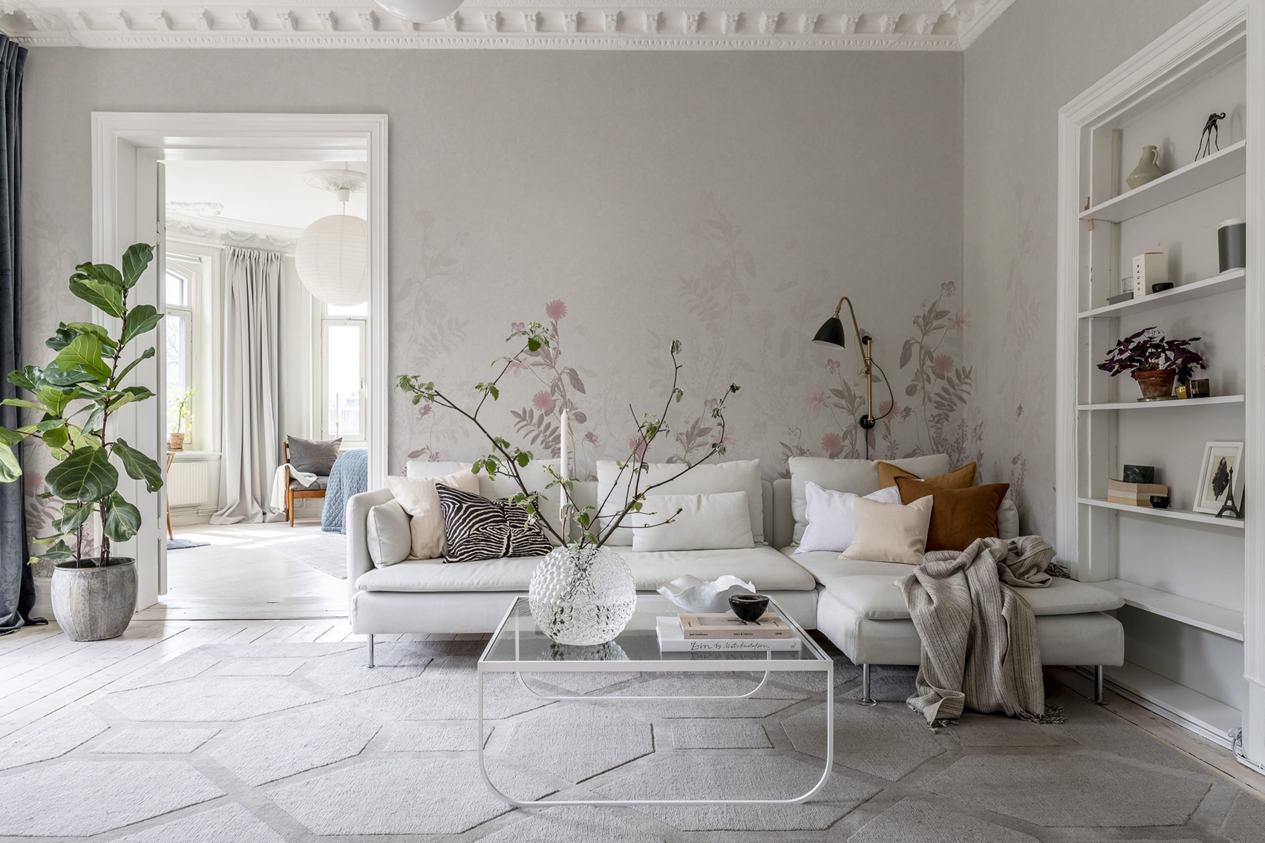 Un design discret, cu flori delicat decolorate, pe un fundal gri deschis.