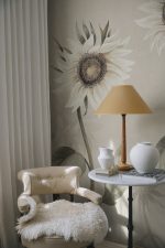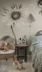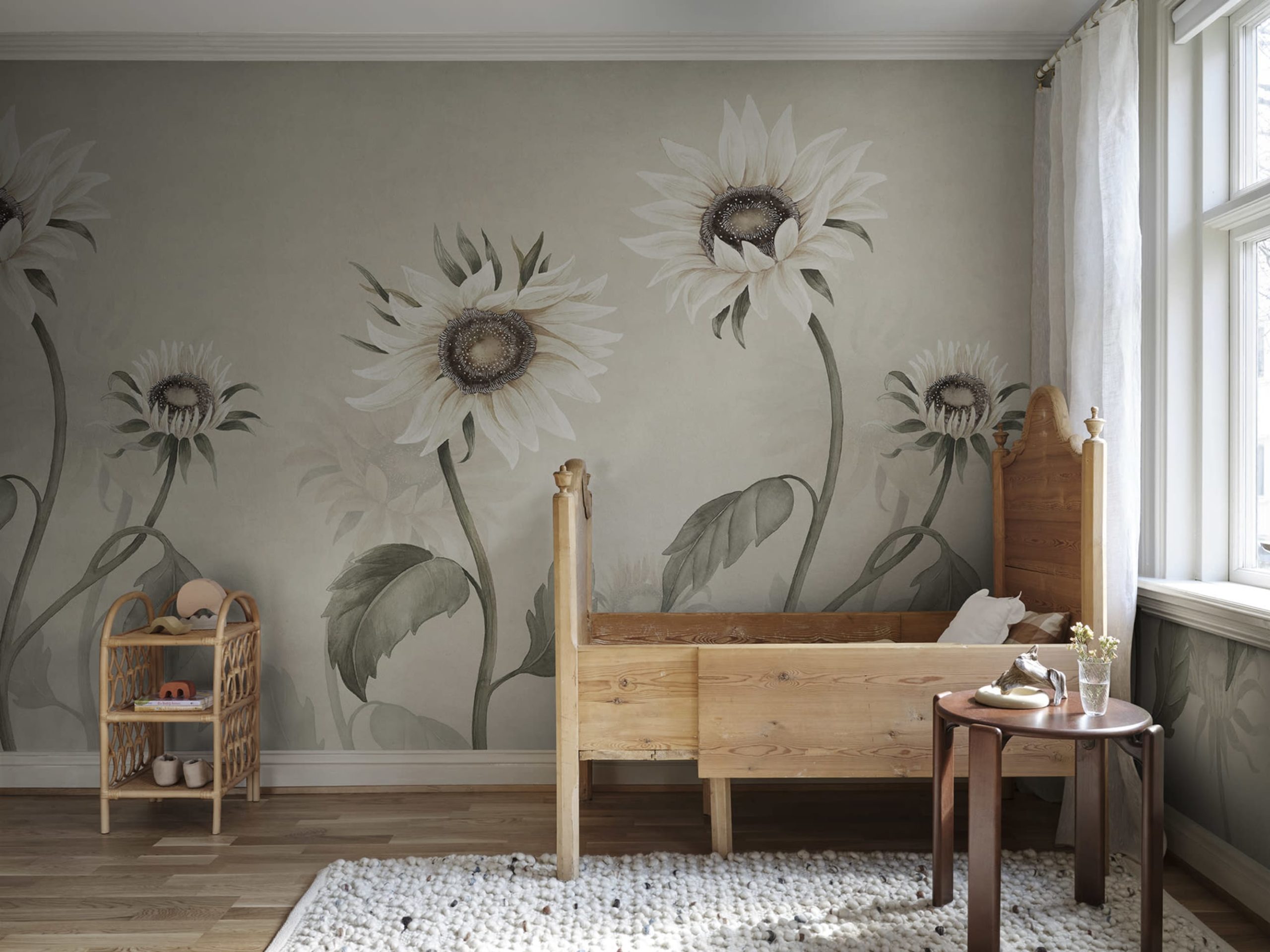Dacă Öland ar putea avea o altă floare provincială, marea floarea-soarelui ar primi votul nostru. Pictura noastră murală cu floarea-soarelui înflorește blând ca un simbol al verii, al soarelui și al insulei Öland. Floarea-soarelui, albă, are flori grațioase în alb, maro și verde pe o bază bej.