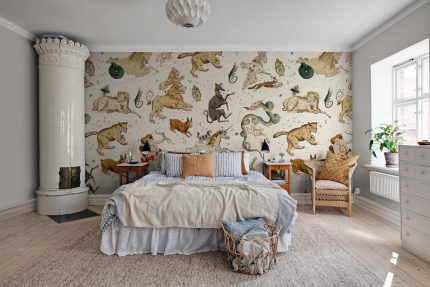 Jungle pattern tapet, VLAdiLA, featuring cheetahs leaping through lush palm trees on a black background. This stylish tapet will add