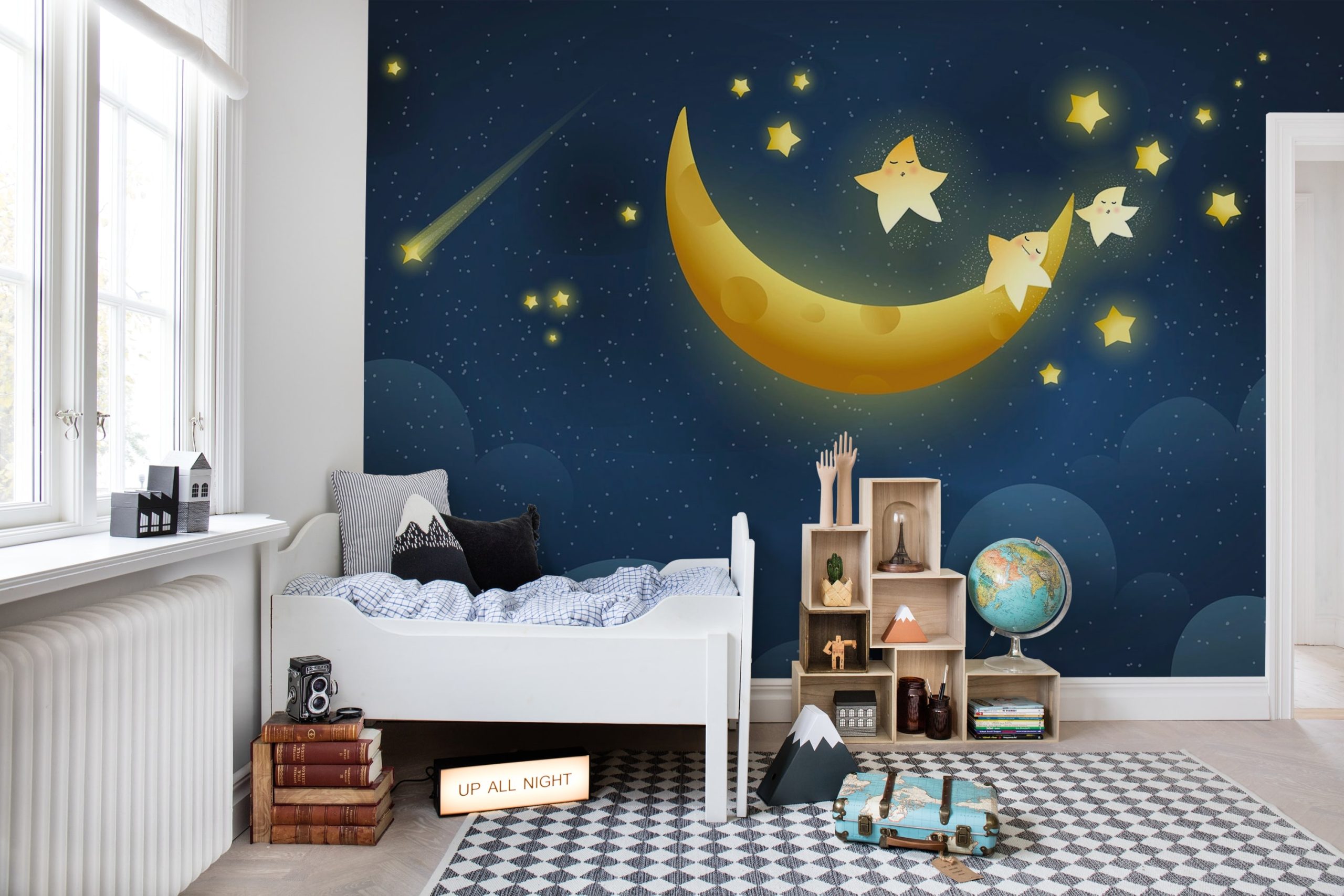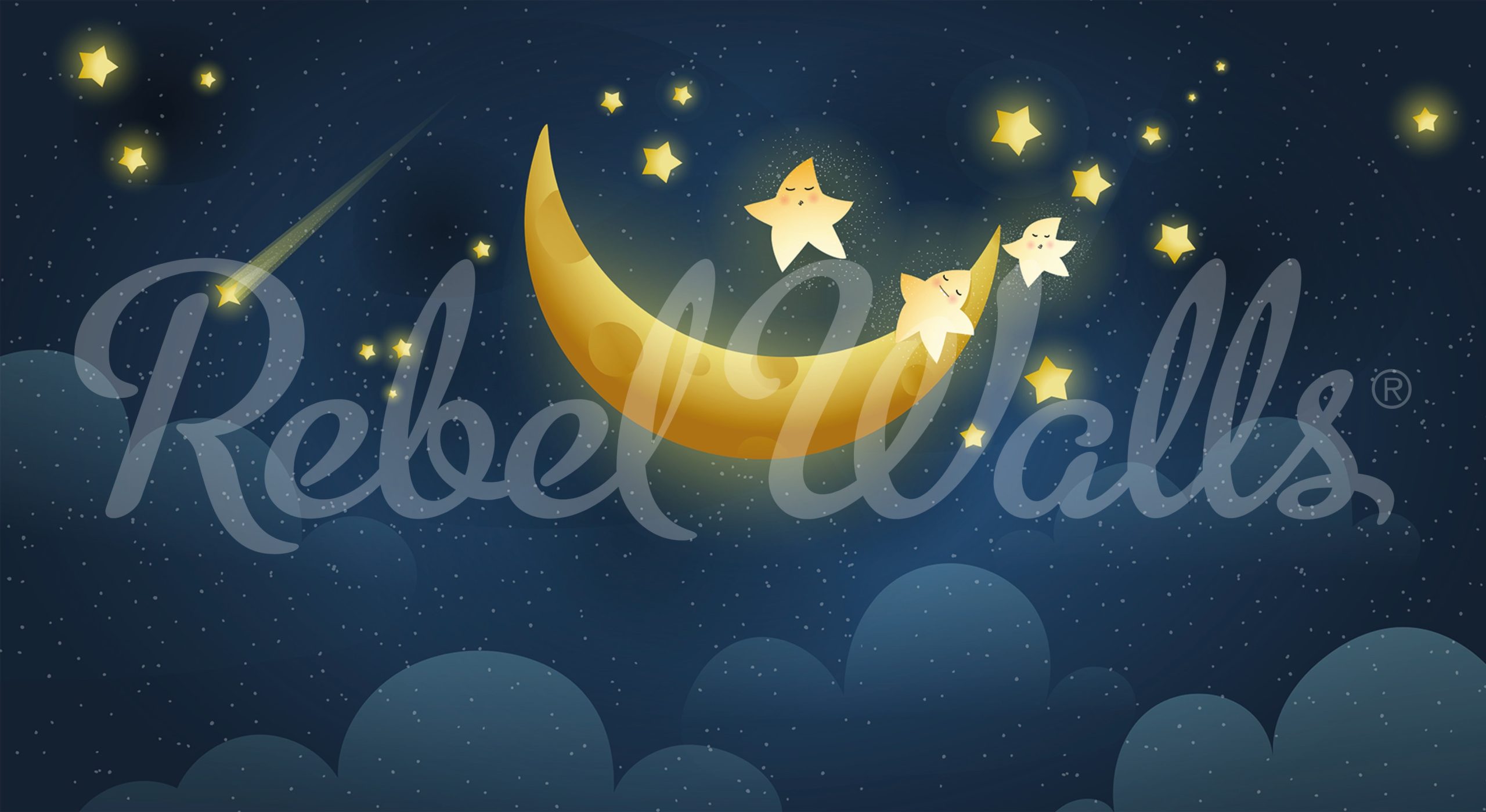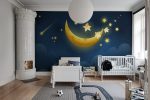 Îmbrățișați influența liniștitoare și calmantă a cerului nocturn luminat de lună cu tapetul Sweet Dreams. Ilustrația fermecătoare a unei luni înconjurată de stele creează un decor liniștit, încurajând vise dulci și nopți odihnitoare în camerele copiilor sau ale dvs.