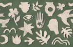 Îmbrățișați un design jucăuș, dar îndrăzneț, cu simboluri și forme asemănătoare șabloanelor în culorile verde și bej. Această operă de artă grafică este plină de stele, flori, mâini și ochi tăiați manual. Marginile inegale și culorile pământii creează o atmosferă vie și contemporană care se adresează sufletului artistic.