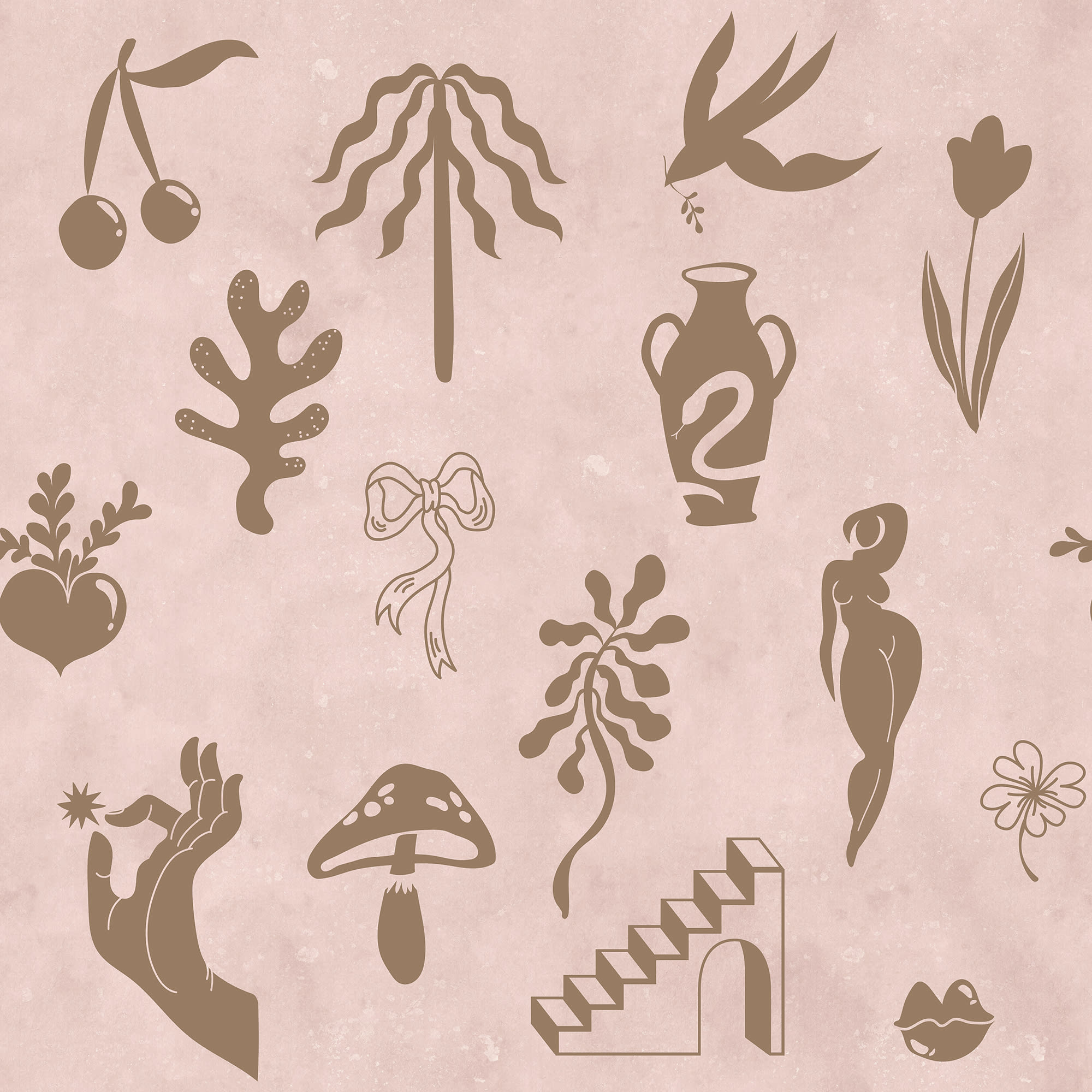 Descoperiți o gamă jucăușă de pictograme simbolice pe un fundal roz suav. Prezentând cireșe, o pasăre zburătoare, o formă feminină senină și multe altele, fiecare element emană creativitate și farmec. Acest tapet aduce o notă capricioasă și artistică spațiului dvs., menținând în același timp o estetică modernă.