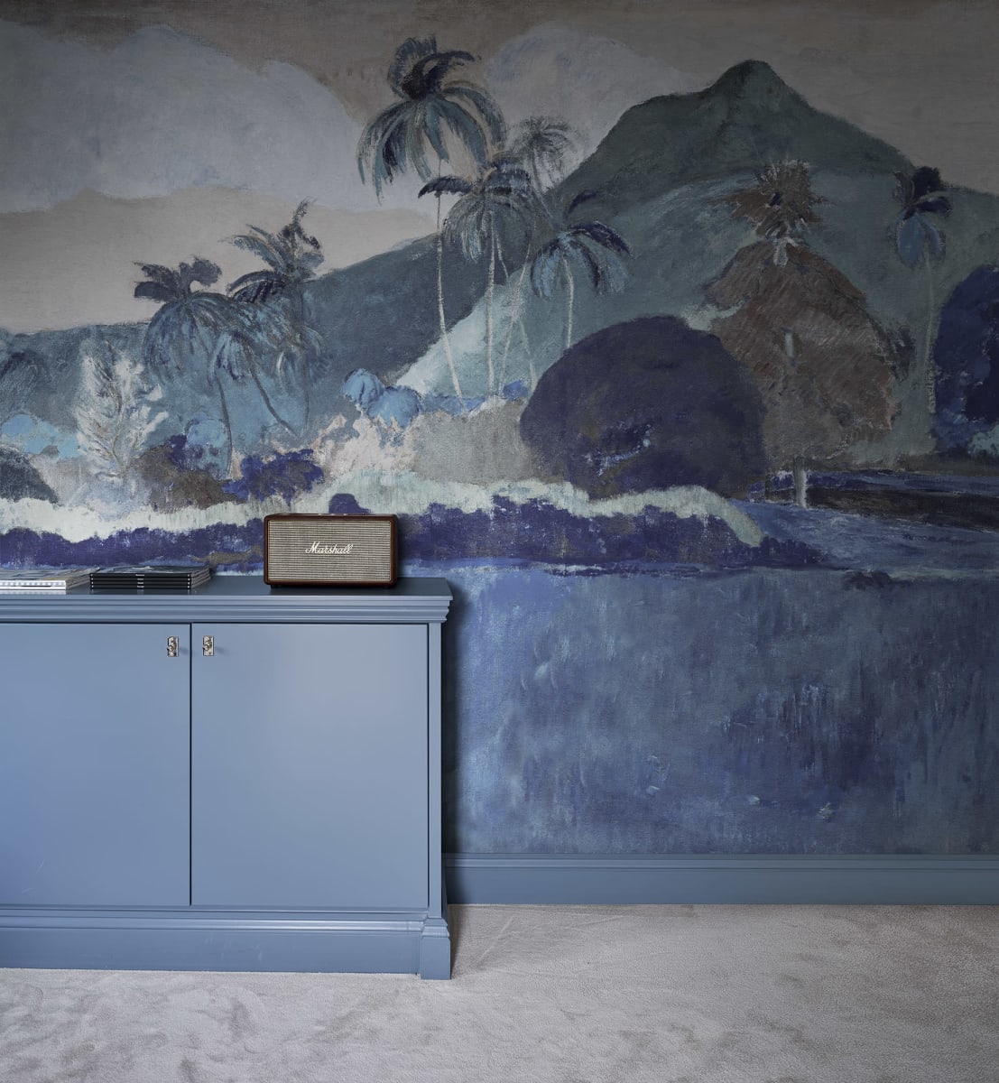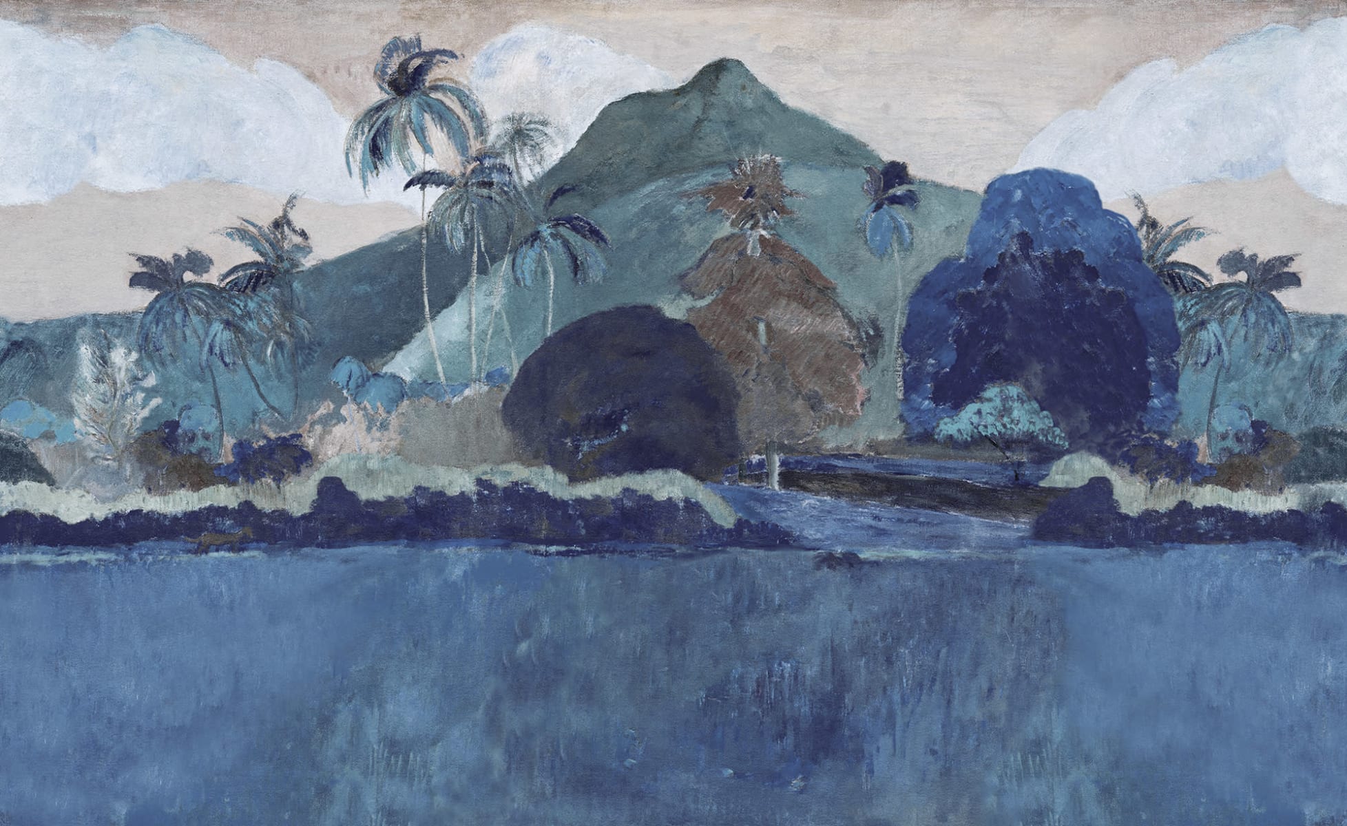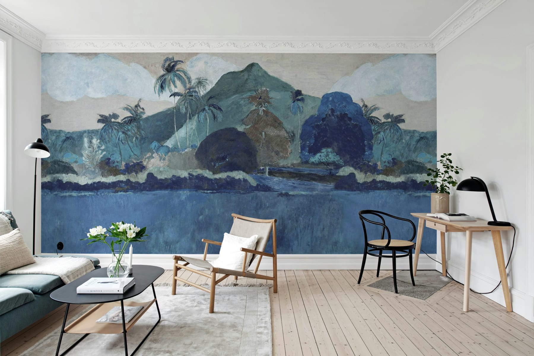 Tahitian Landscape, Blue, este o nouă versiune de tapet albastru a faimoasei opere de artă a lui Gaugin, Tahitian Landscape. Culoarea Albastru prezintă câmpuri învolburate în albastru și bej, răcoroase și senine.