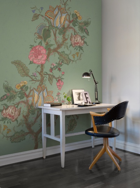 Crenguțele înflorite, brodate parcă, de pe fototapetul nostru, vă aduc primăvara mereu în casă! Motivul floral delicat, în nuanțe pastelate, pe fundal verde, oferă o atingere romantică și boemă.