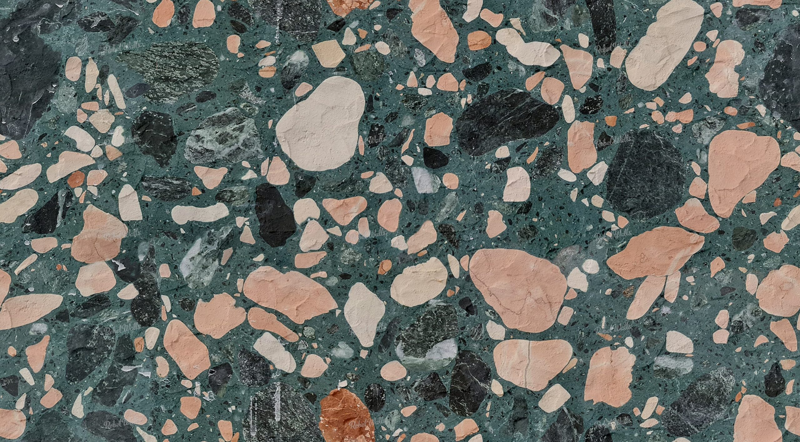 Terrazzo Bold, Emerald este un model care este inspirat din Grecia antică și Italia. Piatră zdrobită într-o culoare verde și nisip pentru acel aspect mediteranean.