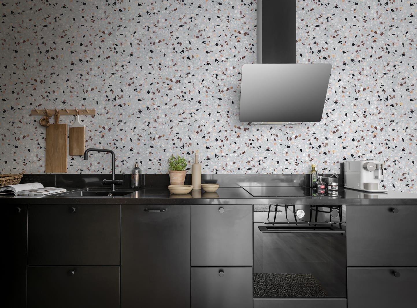 Adăugați structură și viață încăperii cu un tapet din piatră de terrazzo.