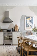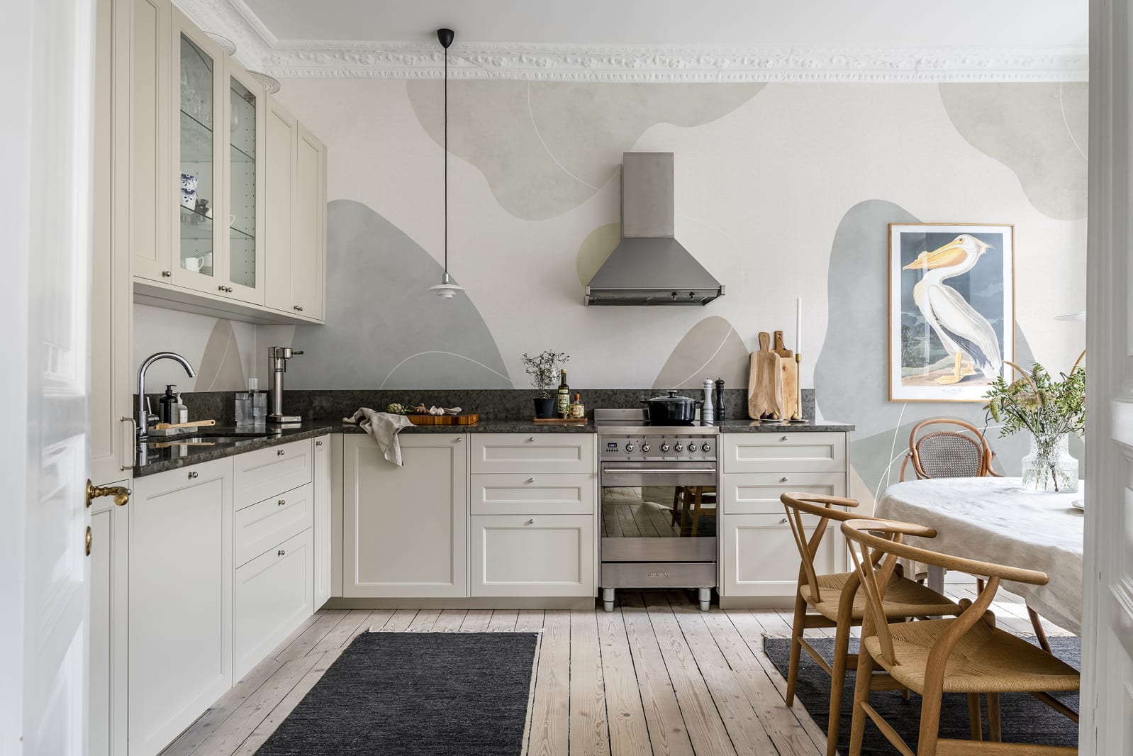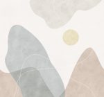 Liniile albe curgătoare grațioase și formele în tonuri pastelate creează un fundal jucăuș și artistic.