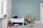 Fototapetul personalizat World Map, Blue, de la Rebel Walls, este o altă reprezentare estetică a hărții mapamondului, de această dată