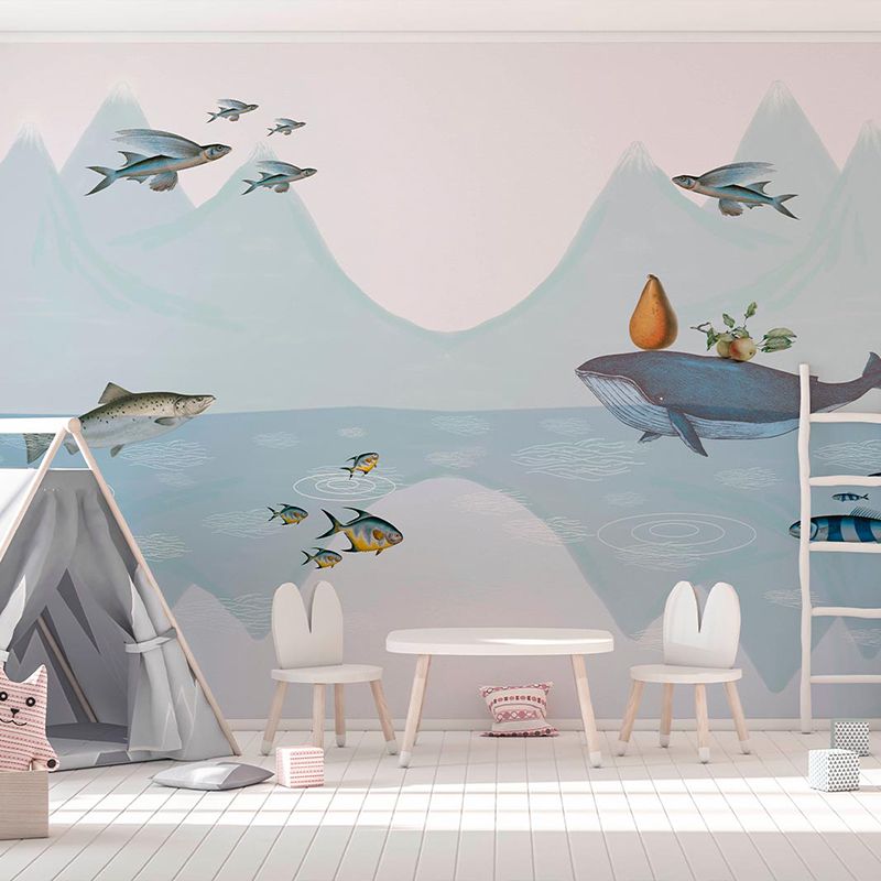 Creează o lume fantastică în camera copilului tău! Acest fototapet cu balene, pești zburători și peisaje montane va stimula imaginația și creativitatea. Un decor ideal pentru un spațiu plin de aventură și culoare.