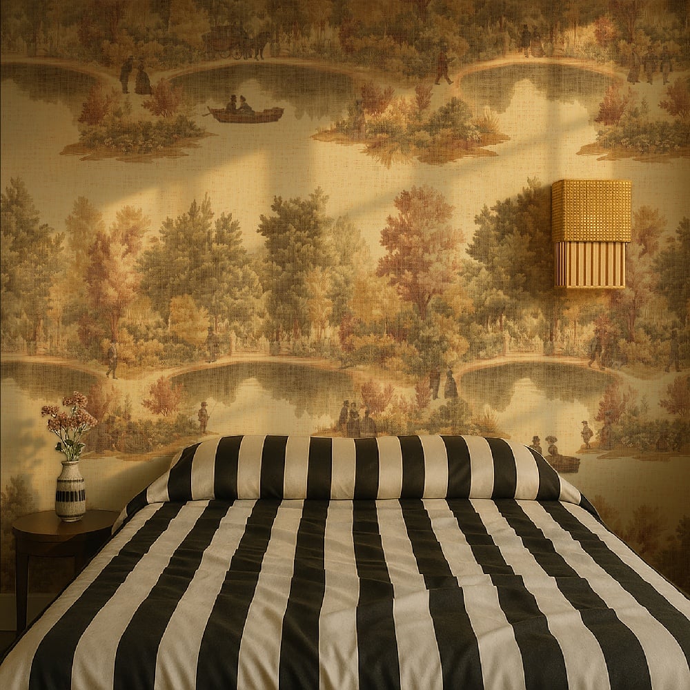 Designul propune o compoziție ritmică și echilibrată, în care vegetația – arbori în nuanțe calde de ruginiu, verde măsliniu și galben-auriu – creează o atmosferă de reverie liniștită. Personajele umane, atent integrate în peisaj, adaugă profunzime narativă, fără a domina scena. Ele sugerează ritualuri sociale elegante, întâlniri discrete și rafinamentul unei vieți trăite cu măsură și bun-gust.