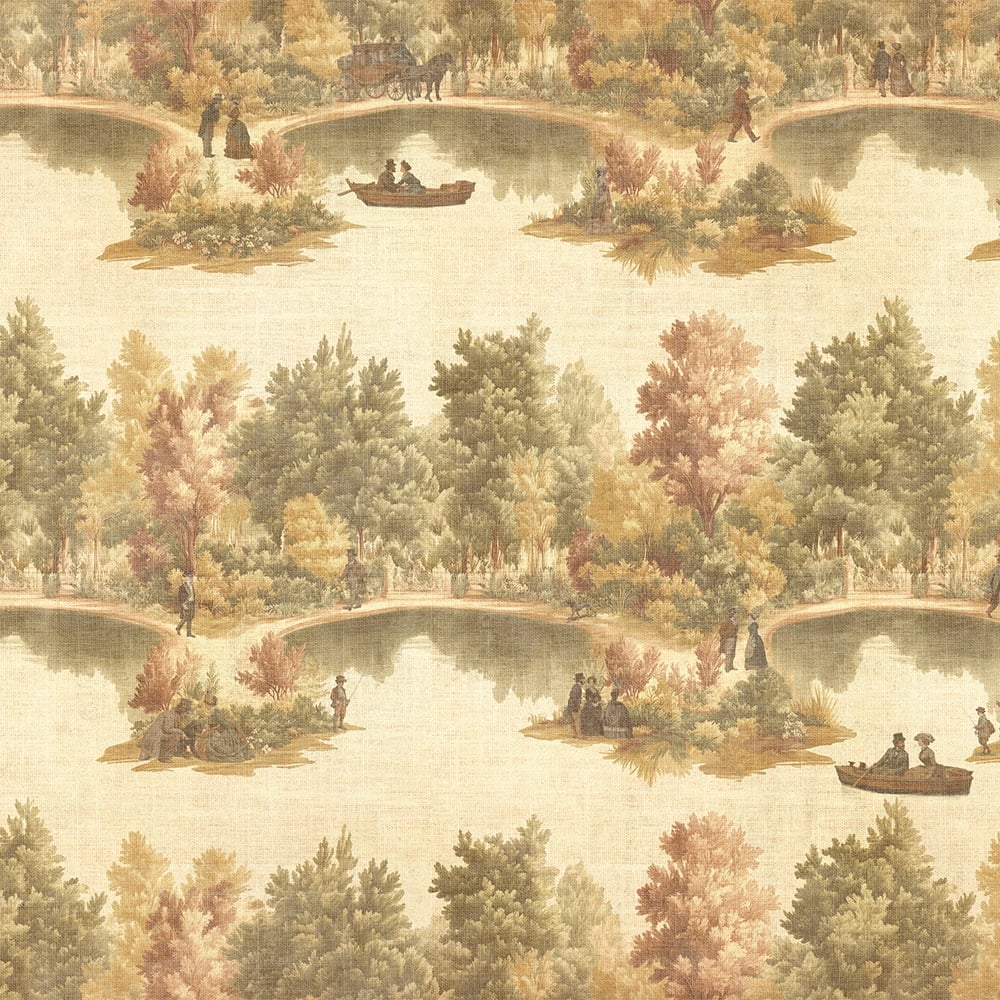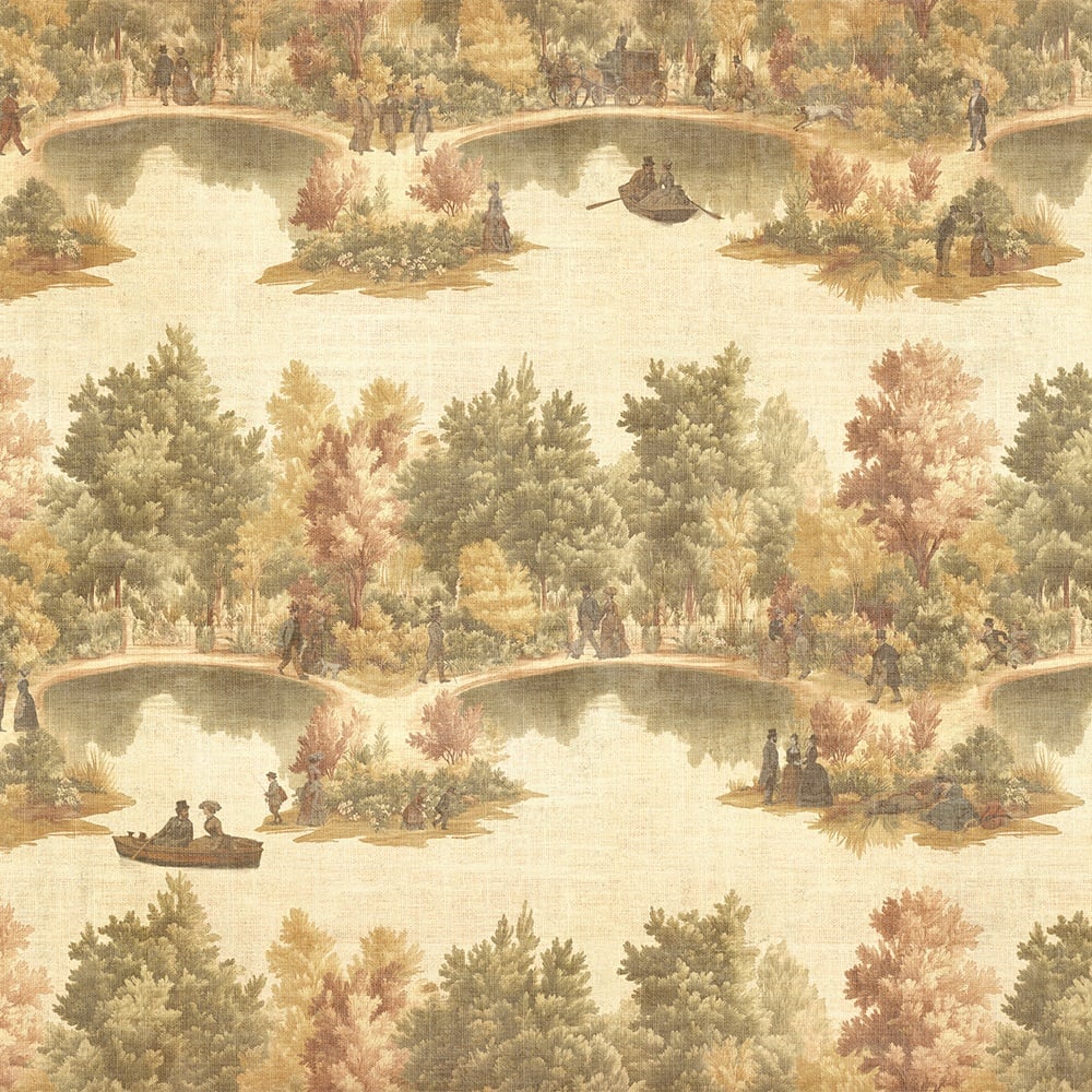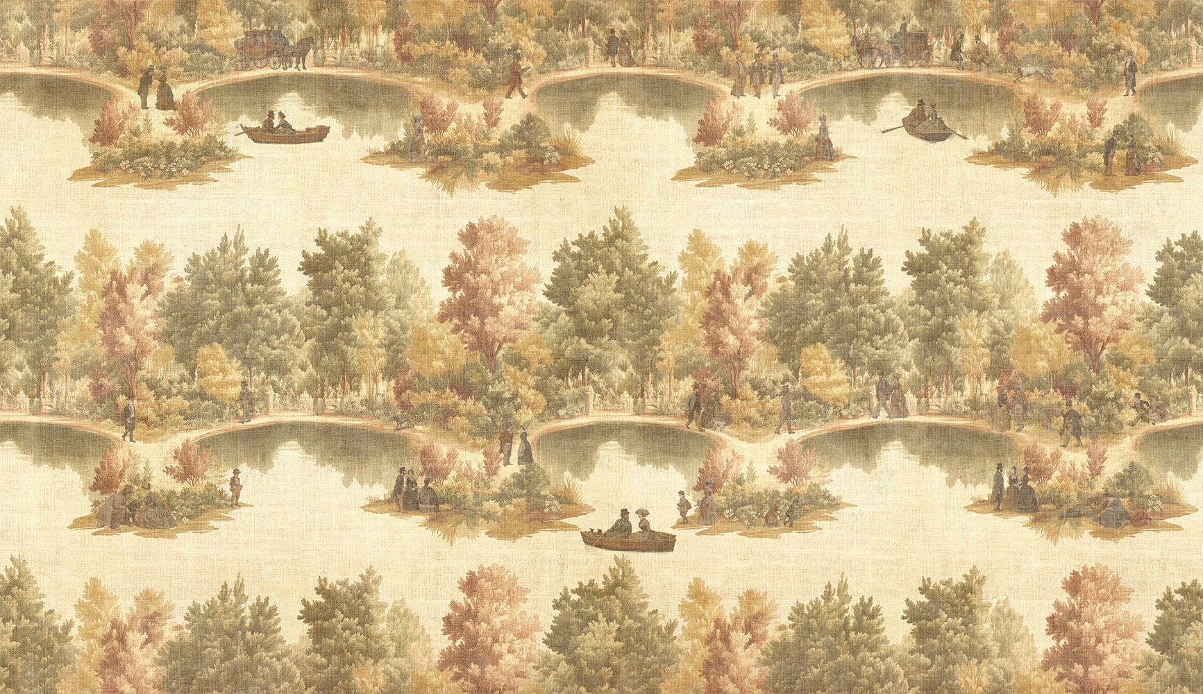 Tapetul The Willow Promenade din colecția Britannia redă cu o sensibilitate nostalgică farmecul vieții cotidiene aristocratice în aer liber, specific epocii victoriene și începutului de secol XX. Scena pastorală repetitivă prezintă un parc natural idilic, în care doamne și domni bine îmbrăcați se plimbă, conversează sau se bucură de o plimbare cu barca, într-un decor de toamnă calmă, reflectat pe luciul liniștit al unui lac.