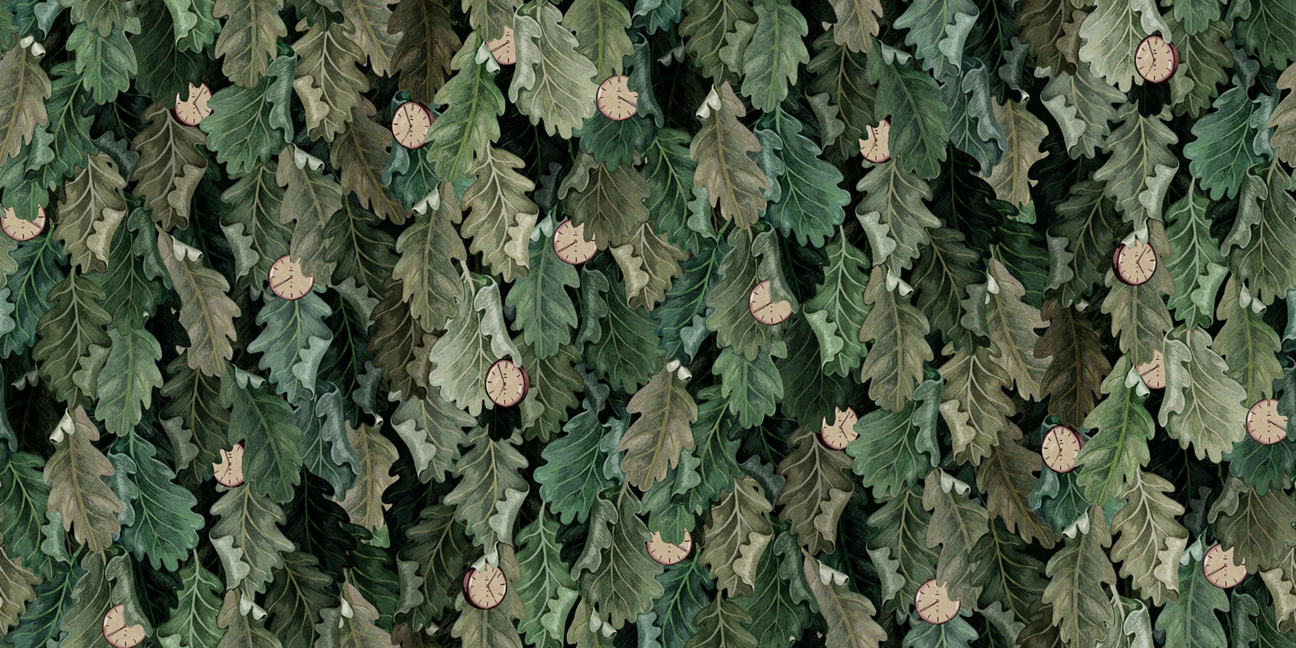Timpul zboară, dar nu te vei sătura niciodată de acest tapet luxuriant cu frunze de stejar pictate manual și ceasuri de buzunar.