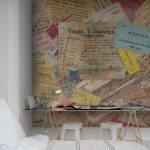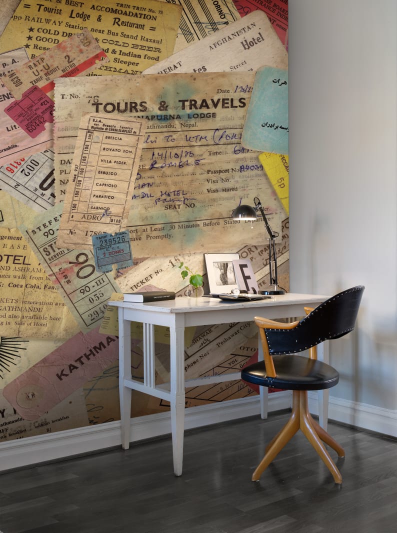 Tours and Travels este un fototapet cu un design nostalgic realizat cu un colaj din bilete vechi.