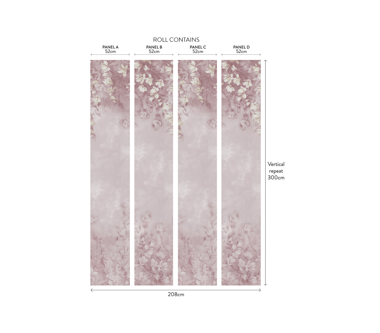 O rolă conține 4 panouri (A, B, C și D) pentru designul complet. Modelul poate fi repetat pentru a acoperi pereți mai mari de 2 metri utilizând o altă rolă în aceeași ordine (A B C D). În funcție de înălțimea peretelui, panoul poate fi decupat în partea de sus, jos sau ambele pentru a crea scena dorită.