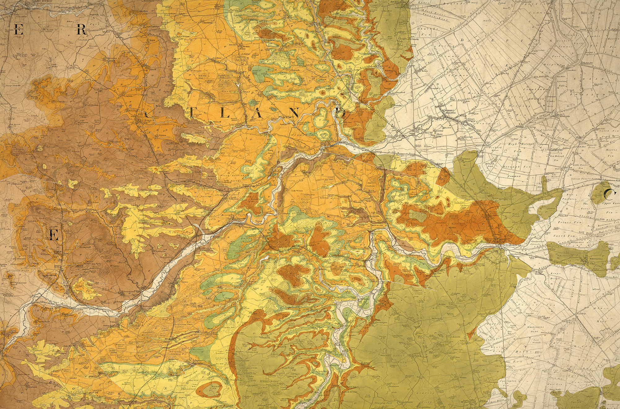 Drumuri mici și mari, șine de tren traversează această hartă și te cheamă să privești acest tărâm minunat. Faptul că harta e incompletă, sau cel puțin nu este colorată peste tot, adaugă doar un plus de frumusețe. Acest fototapet arată parte a Marii Britanii și Țara Galiilor și datează din 1885.
