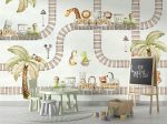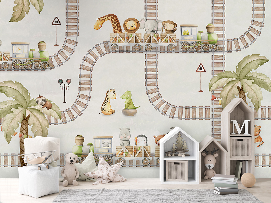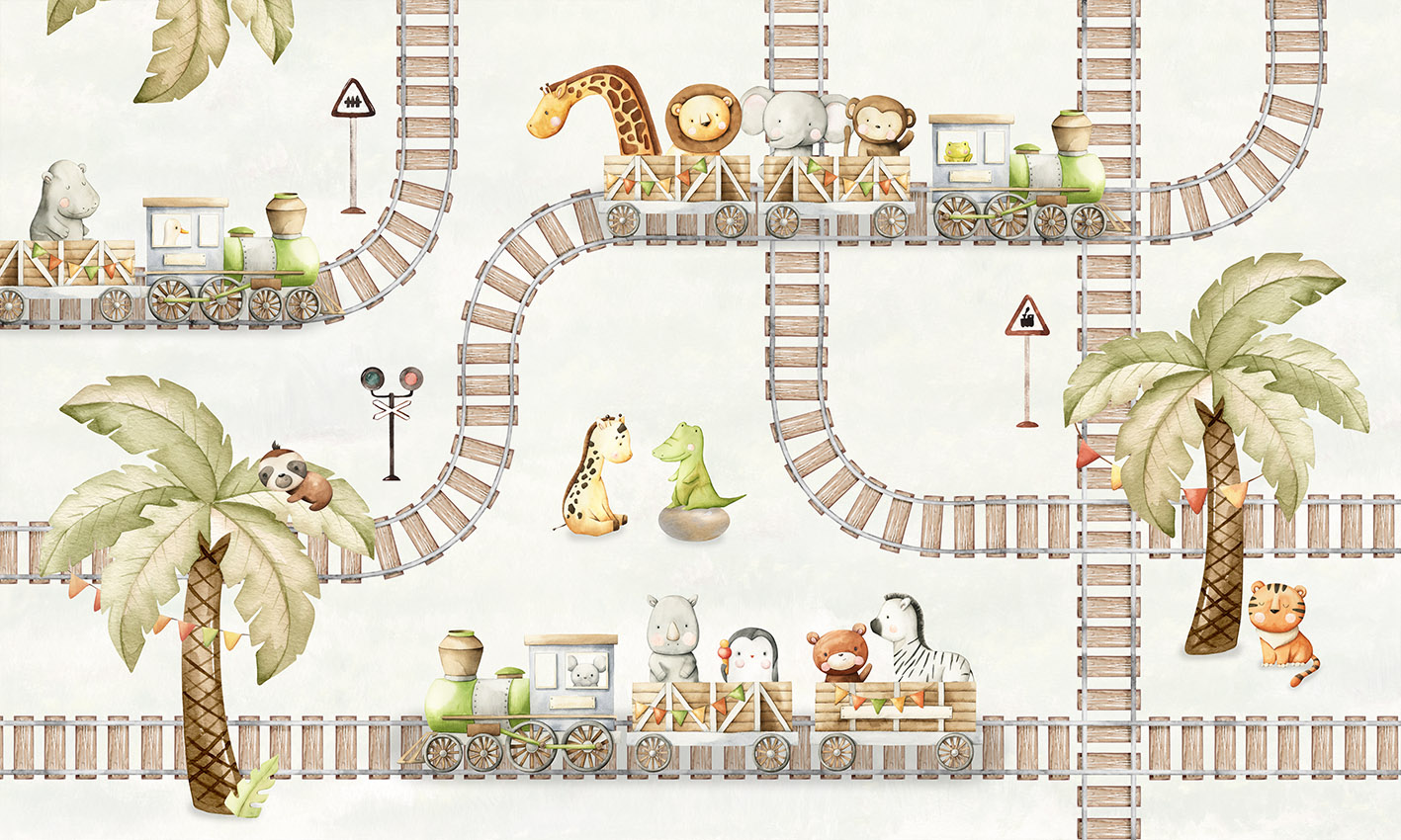 Creează o cameră magică pentru copii cu acest tapet încântător. Design-ul prezintă un tren adorabil cu animale și peisaje tropicale. Perfect pentru a adăuga o notă veselă și creativă în orice spațiu dedicat celor mici.