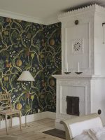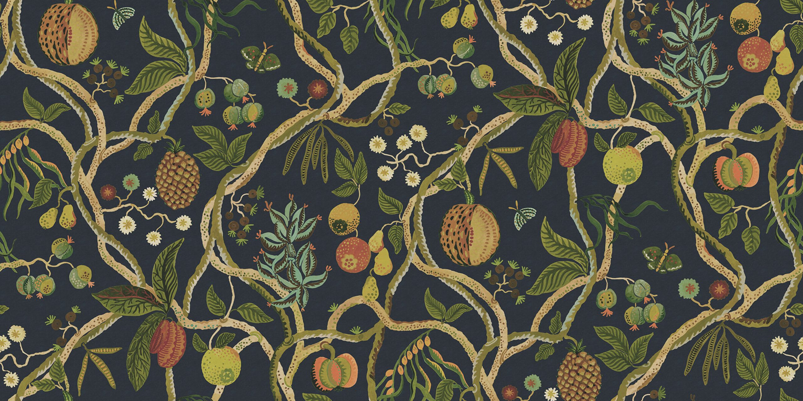 Un copac fantezist pictat manual, inspirat de plantele din Plantae Selectae, împodobit cu fructe decorative împletite. Această pictură murală oferă un aport generos de vitamine în culoare și formă, aducând caracter și bucurie plină de modele. Schema de culori Dark Blue prezintă o bază de albastru marin adânc, completată de un model generos în nuanțe bogate de verde, auriu, ocru și teracotă.
