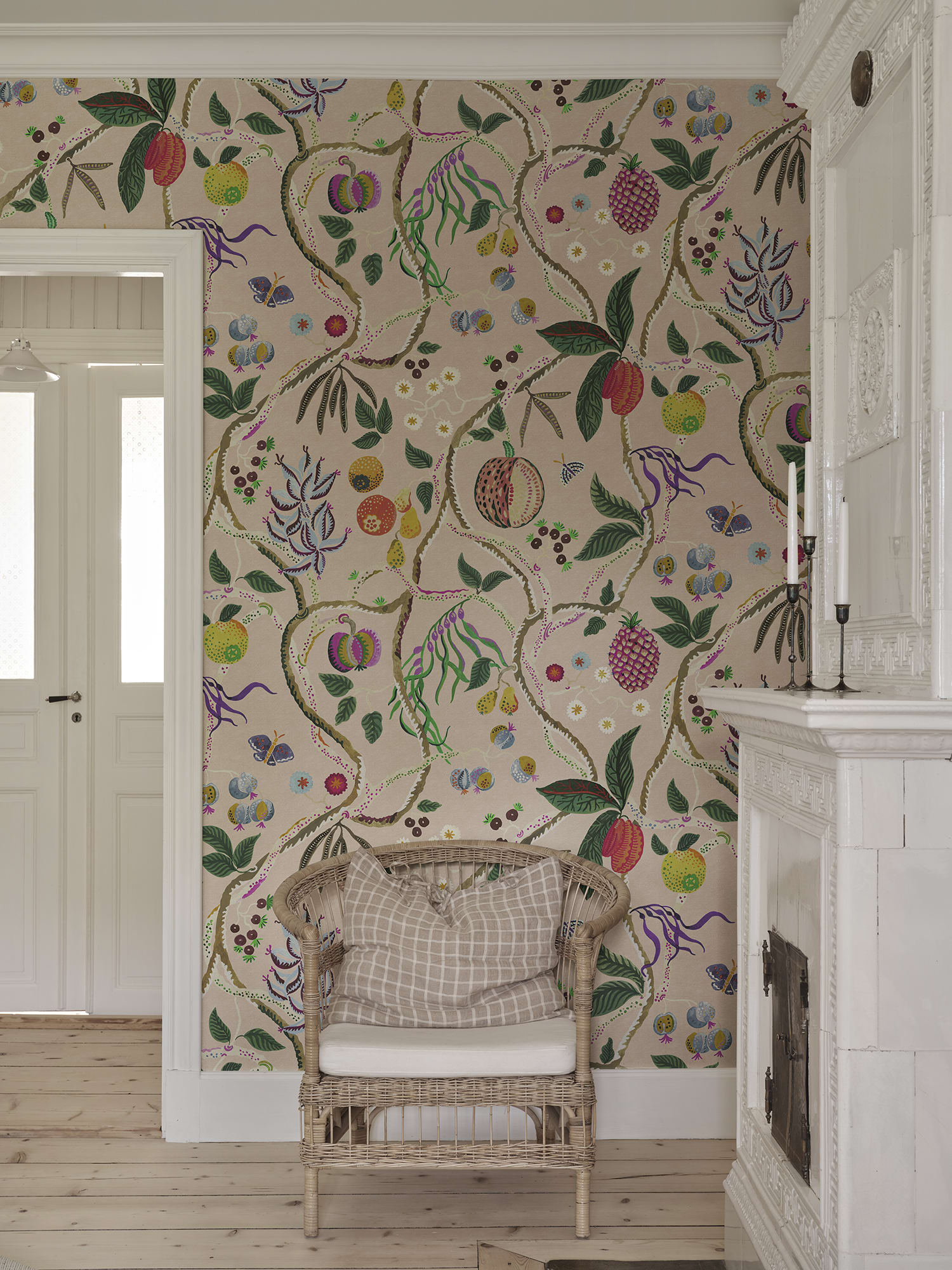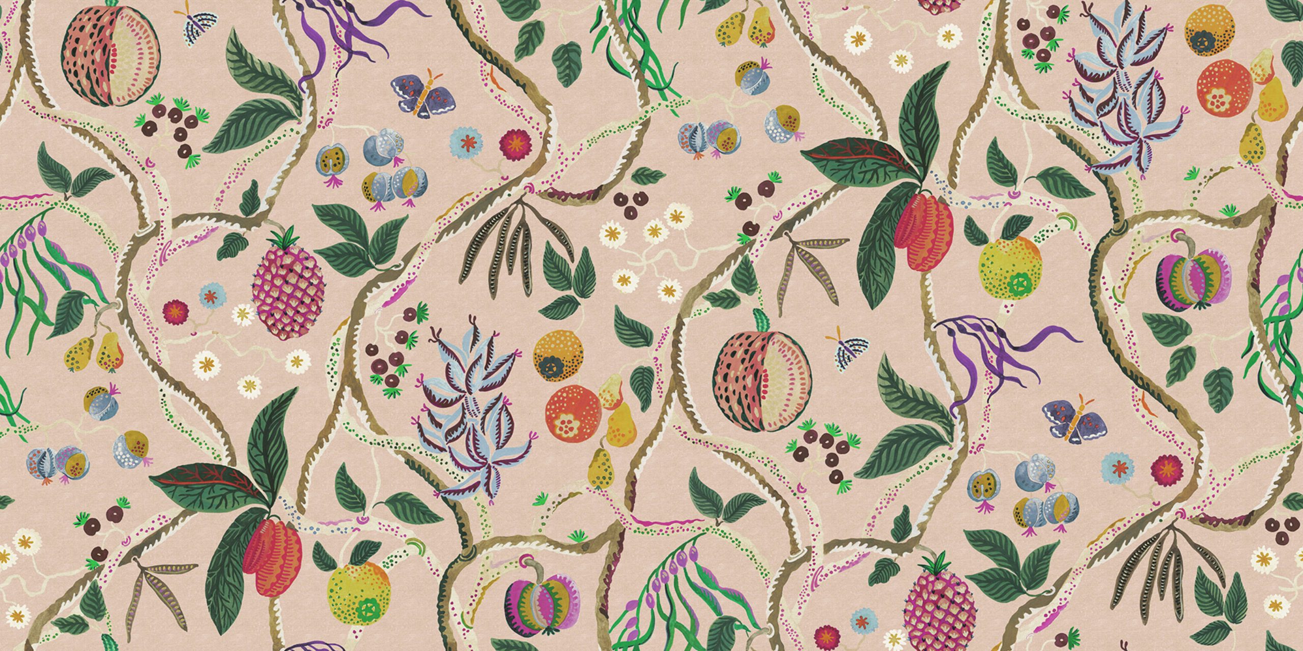 Un copac fantezist pictat manual, inspirat de plantele din Plantae Selectae, împodobit cu fructe decorative împletite. Această pictură murală oferă un aport generos de vitamine în culori și forme, aducând caracter și bucurie plină de modele. Schema de culori roz prezintă o bază caldă de fard de obraz completată de un model generos în nuanțe vibrante de verde, violet, roșu, galben și albastru.