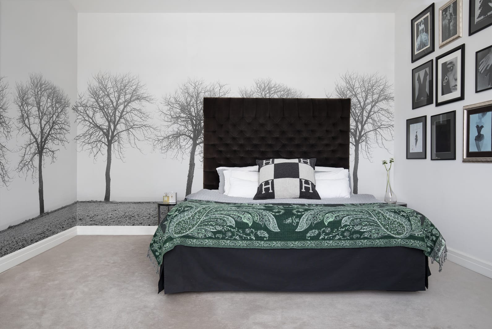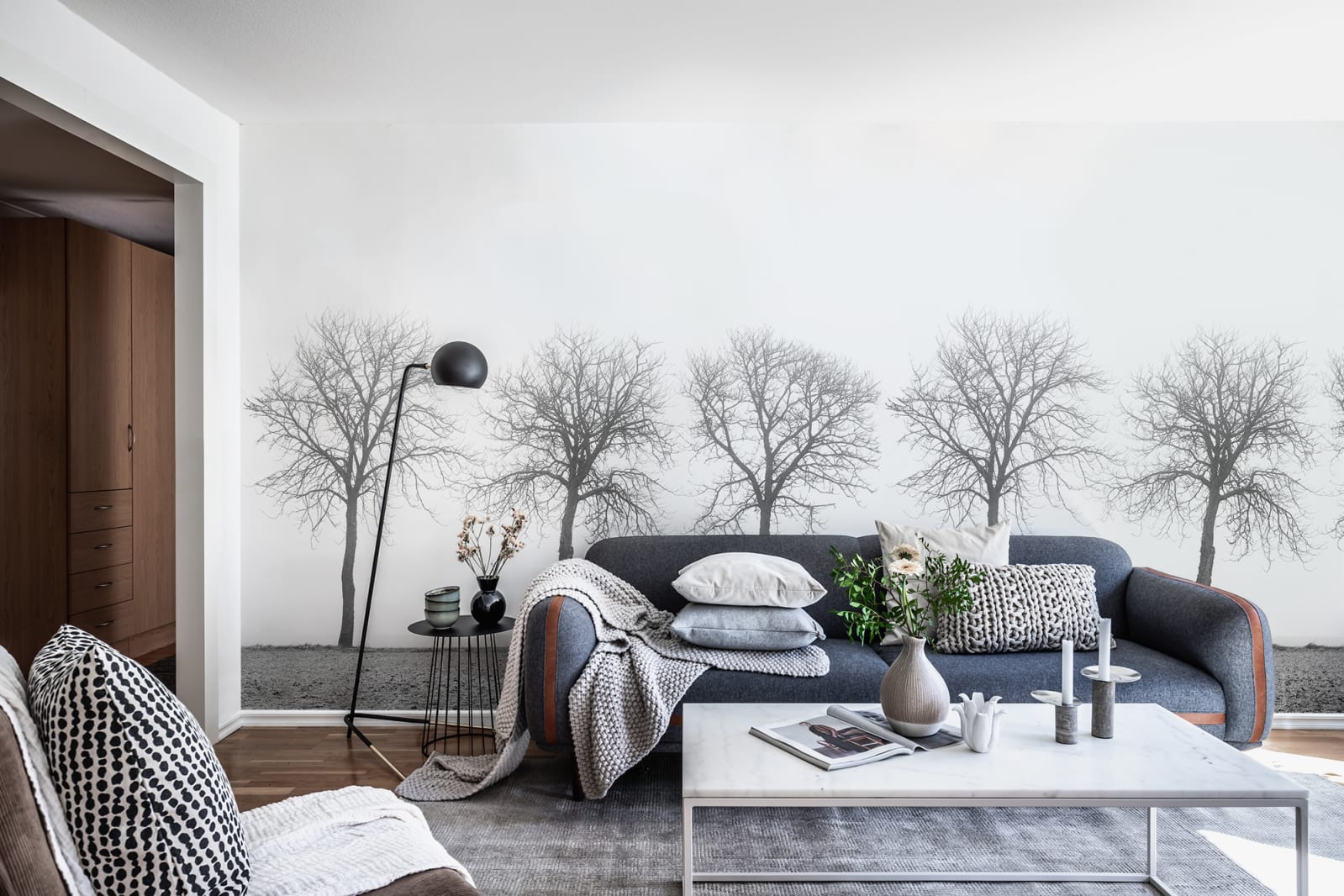 Asemenea unor soldați care stau de gardă, privind nemișcați spre orizont, copacii străjeri din fototapetul nostru îți vor încadra frumos peretele, oferind un efect de adâncime camerei. Un peisaj iernatic, în tonuri alb negru, potrivit unui decor simplu, minimalist.
