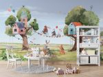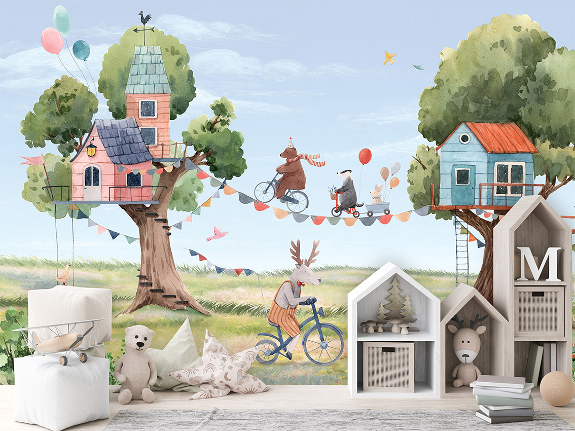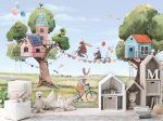 Adaugă un strop de magie camerei copilului tău!Acest fototapet încântător, cu căsuțe în copaci și aventuri cu animale, va transforma orice spațiu într-un loc de joacă plin de imaginație. Perfect pentru o atmosferă caldă și primitoare.