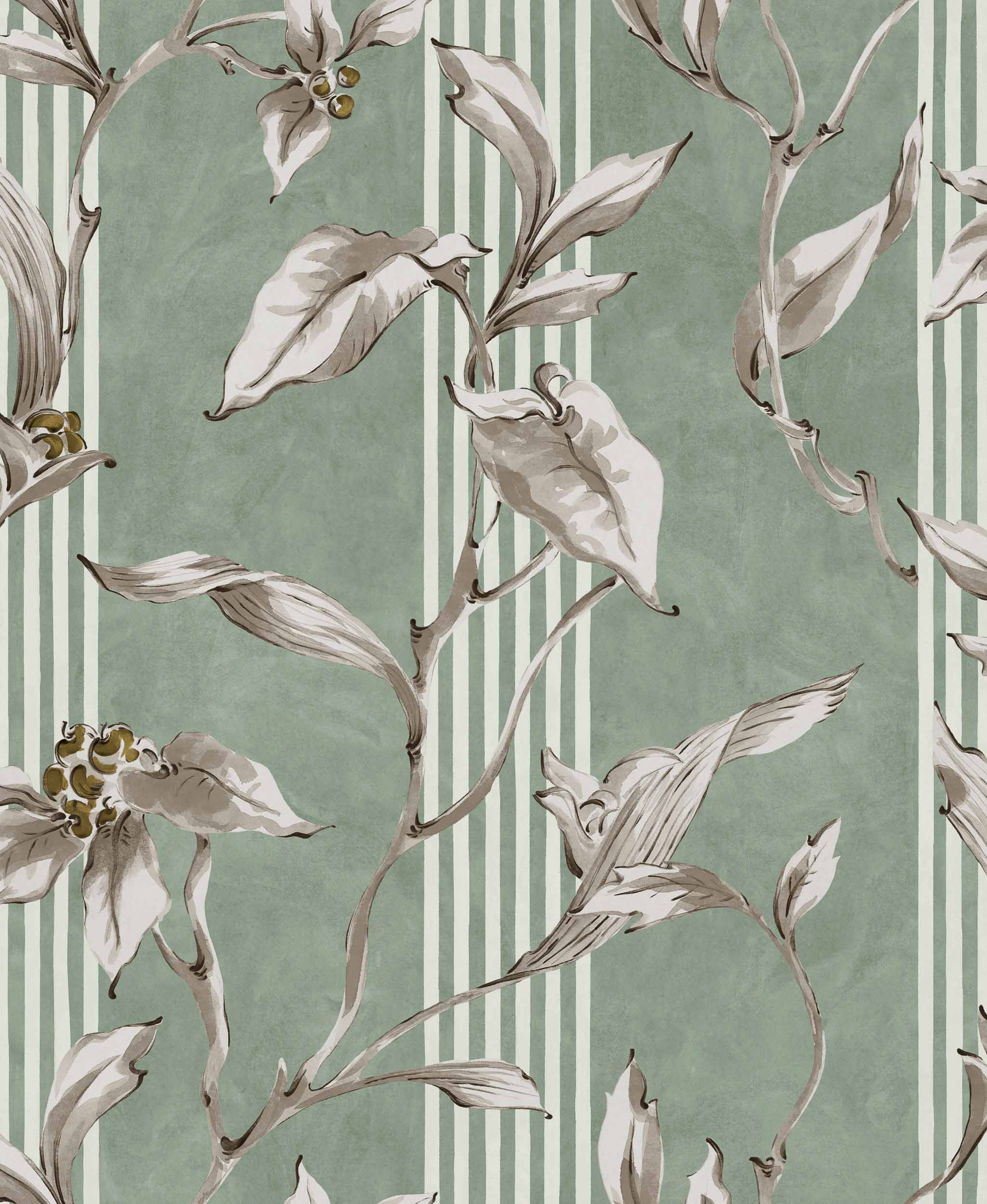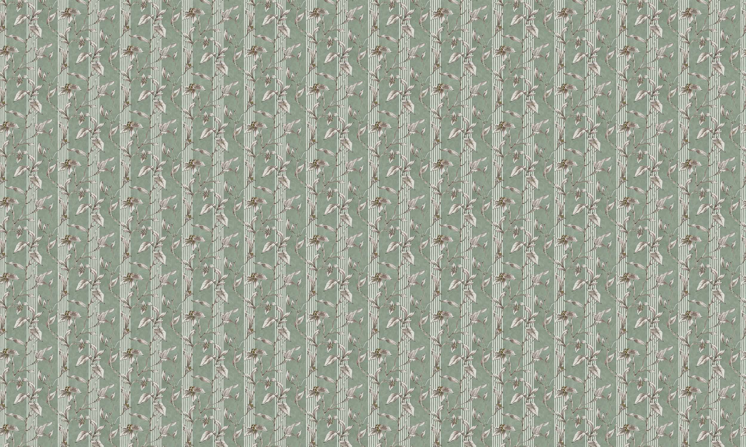 Trepadora, Sage, din colecția Palacio de Cristal, este un tapet de inspirație florală, în tonuri de verde. Ascensiune agilă a ghirlandelor care caută fără teamă lumina puternică a soarelui.