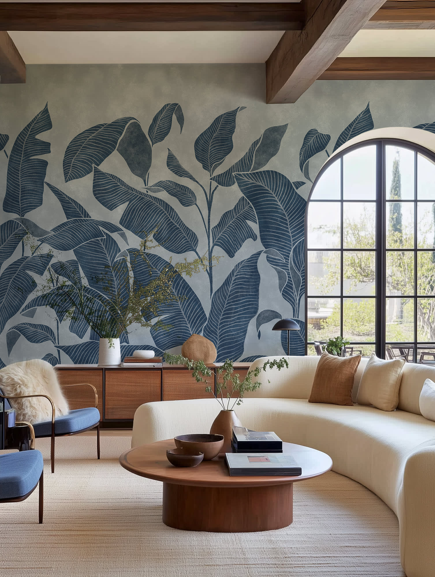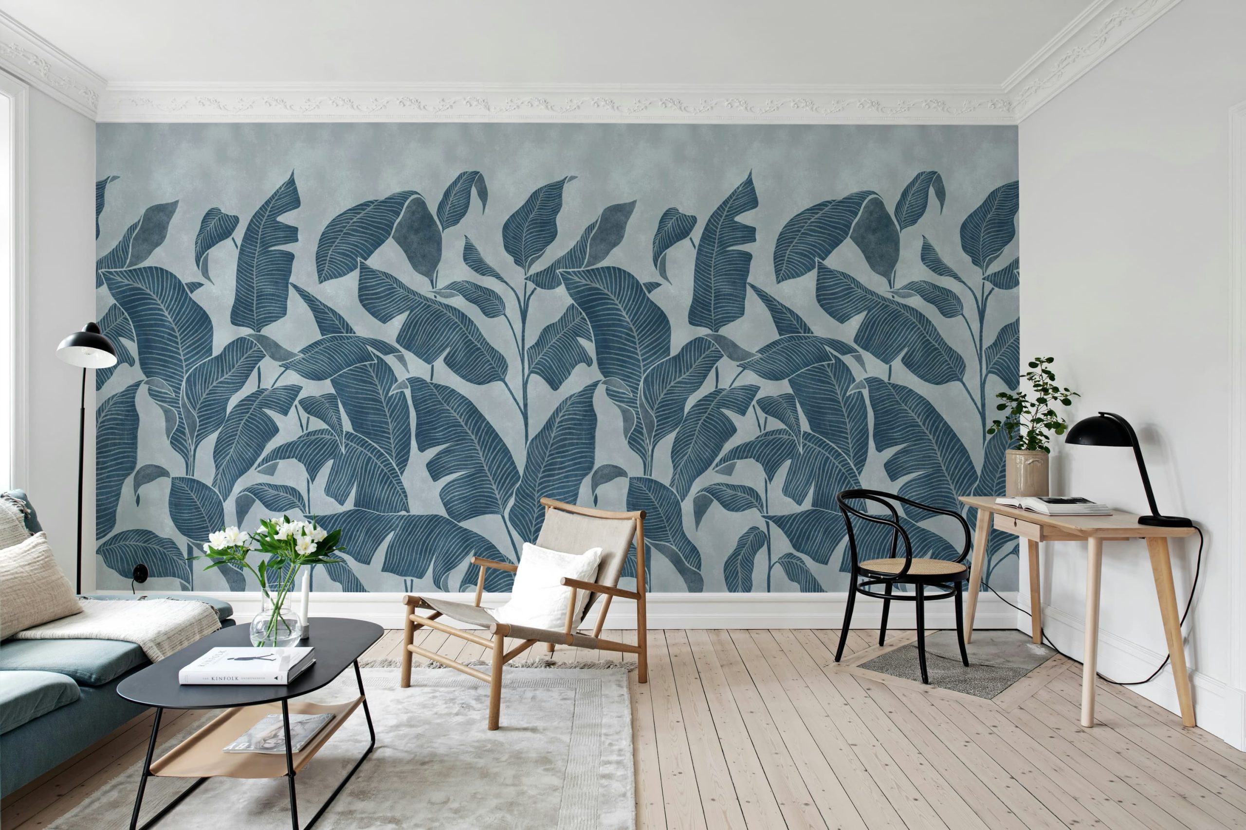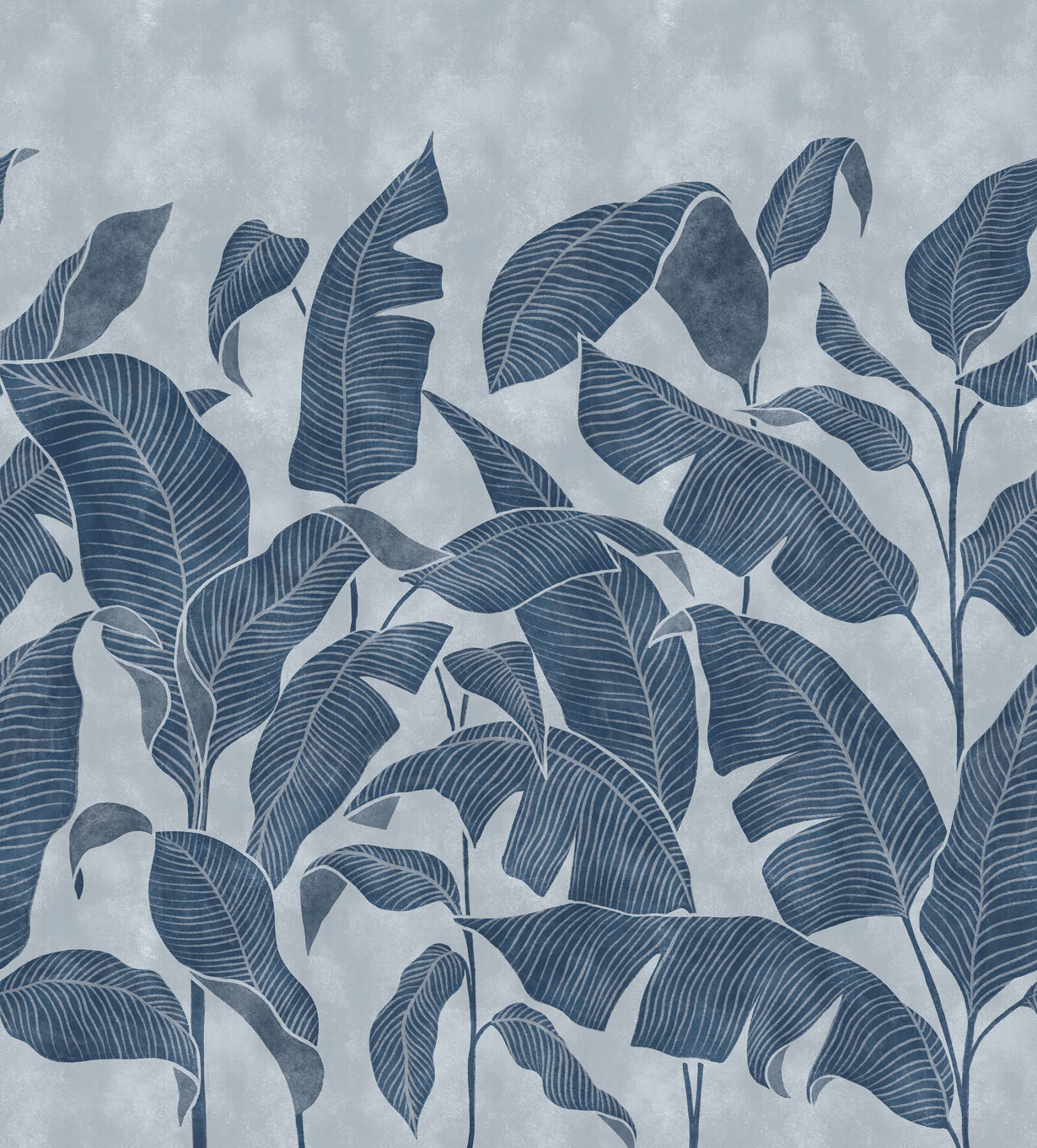 Tapet cu un design inspirat de frunze tropicale, in tonuri de albastru.Perfect pentru a aduce un strop de natura in casa ta.