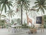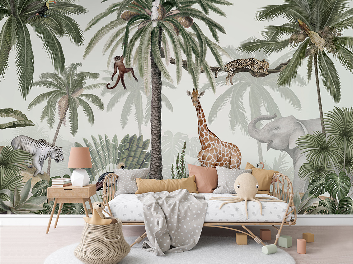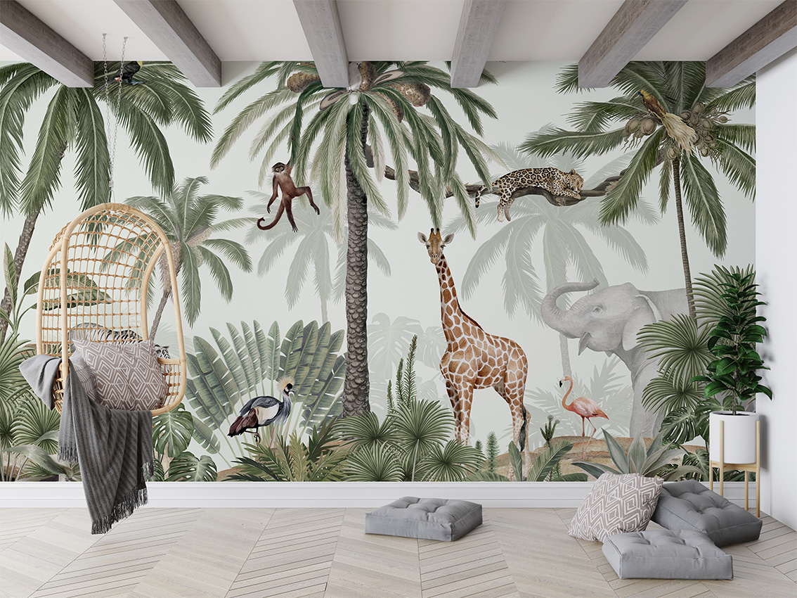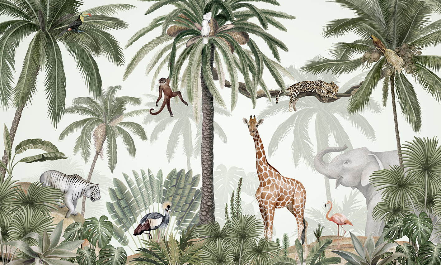 Un tapet vibrant cu un design tropical plin de viață, cu palmieri, maimuțe, un leopard, o girafa și un elefant. Aduceți o bucată de junglă în casa dumneavoastră cu acest tapet.