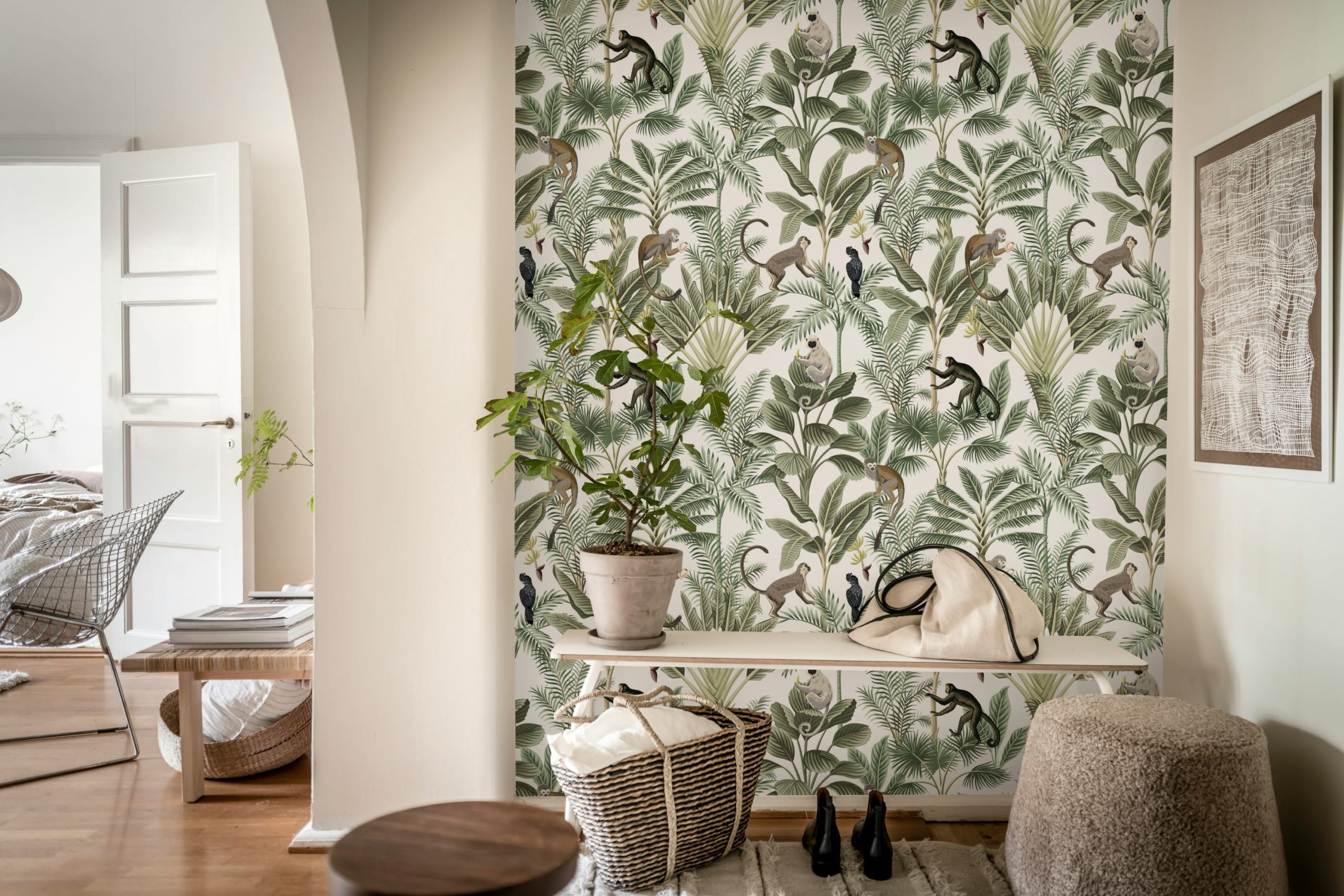 Adaugă o notă exotică spațiului tău cu acest tapet vibrant! Designul cu motive tropicale și maimuțe jucăușe aduce un strop de natură în casa ta. Perfect pentru living sau dormitor. Creează un ambient relaxant și plin de personalitate. Culoare principală: verde.