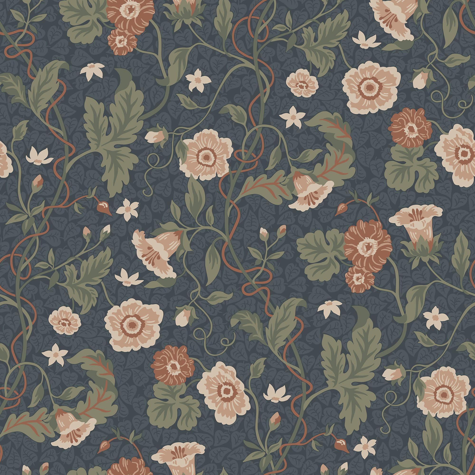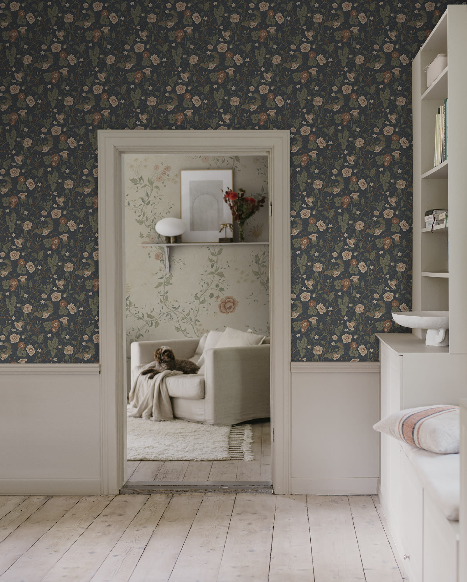 Anemone japoneze, viță de vie în formă de cupă și ghiveci și avene împletite oferă un tapet ușor verde de inspirație Arts & Crafts, cu detalii complicate și un caracter învăluitor. Acest minunat model romantic a fost creat în colaborare cu @lovisaslind. Ulla, Midnight Blue, prezintă verde de grădină și nuanțe de roșu teracotă pe o bază albastru miezul nopții.