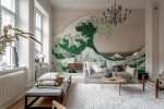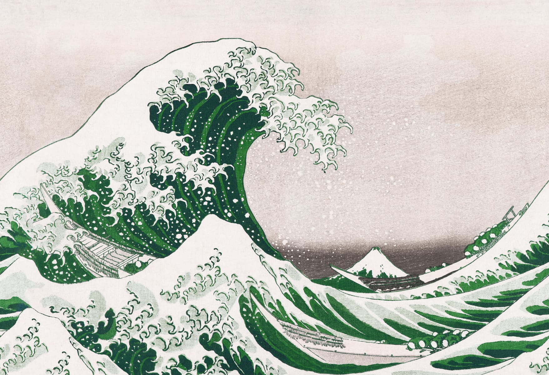Acest tapet extraordinar este o versiune nouă și colorată a celebrei xilogravuri a lui Hokusai reprezentând un val lângă Kanagawa. Culoarea Green este verde și alb viu pe o bază bej moale.