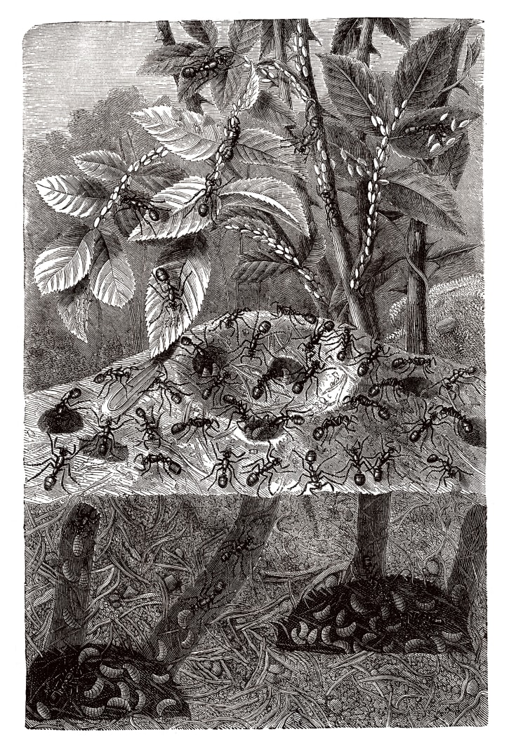 Privește frumosul în fiecare lucru mărunt. Un poster grafic de școală care arată viața și munca furnicilor, deasupra și sub pământ.