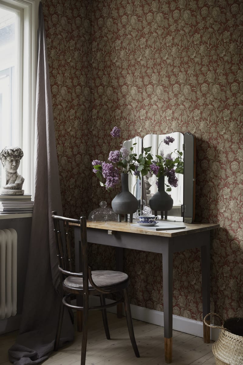 Aspect vintage romantic în care suprafața textilă netedă întâlnește splendoarea florii pasiunii. Design: Johanna Vestlin Informații generale:personalizat:da|Informații generale:mostră disponibilă:da|Tapet >