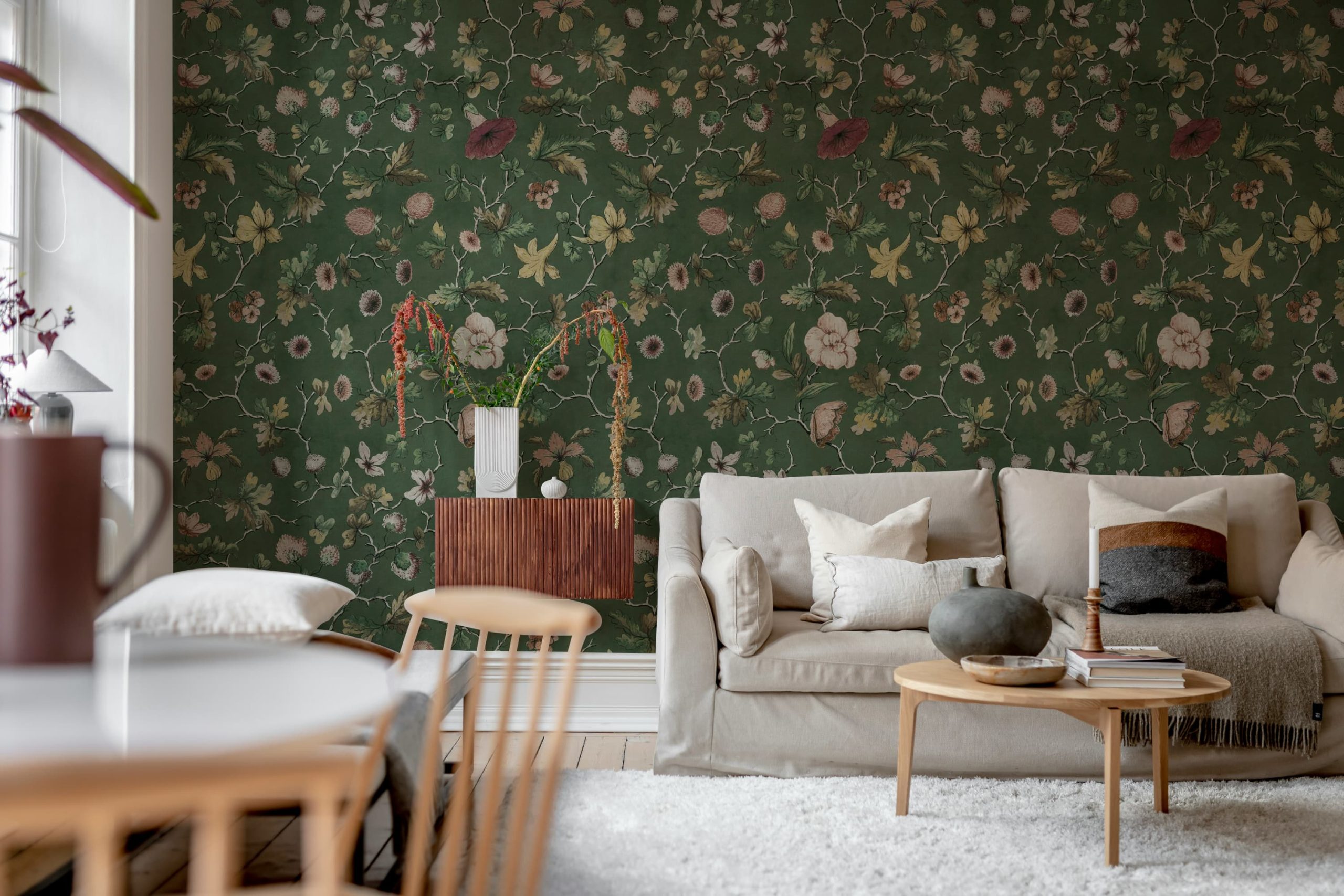 Transformă-ți spațiul cu acest tapet floral verde! Un design elegant, perfect pentru a aduce natura în interiorul casei tale. Creează un decor rafinat și plin de viață cu acest model încântător.