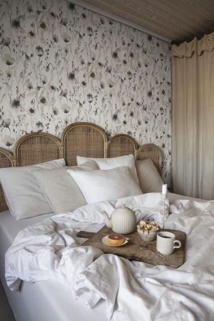 Culorile pastelate, liniștitoare, macii încântători și rămurelele delicate vă vor da impresia de lejeritate, de plutire în aer. Lo conferă