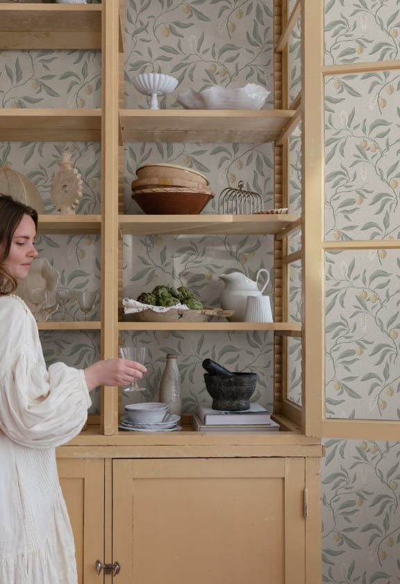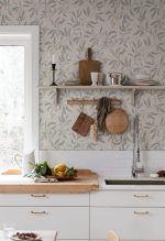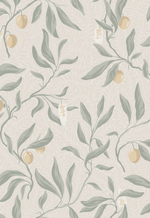 Ramuri frumos pictate manual cu fructe de lychee într-o mare de frunze mici. Un design atemporal realizat cu o tehnică tradițională de imprimare. Această metodă conferă tapetului o suprafață texturată și un caracter vibrant.